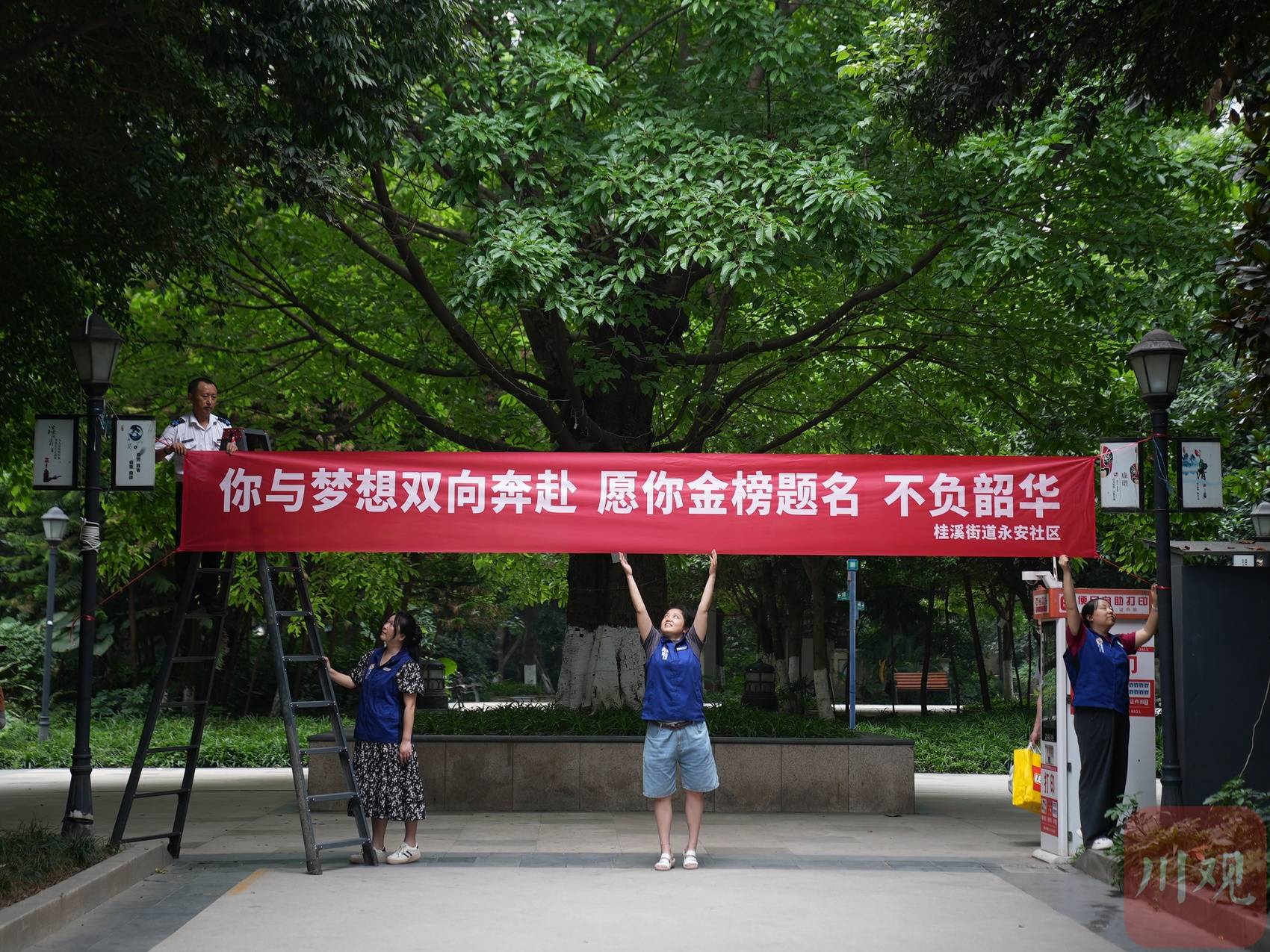 6月6日,桂溪街道永安社区工作人员在辖区内一小区,与物业人员一起在大门口挂上为考生加油的横幅。