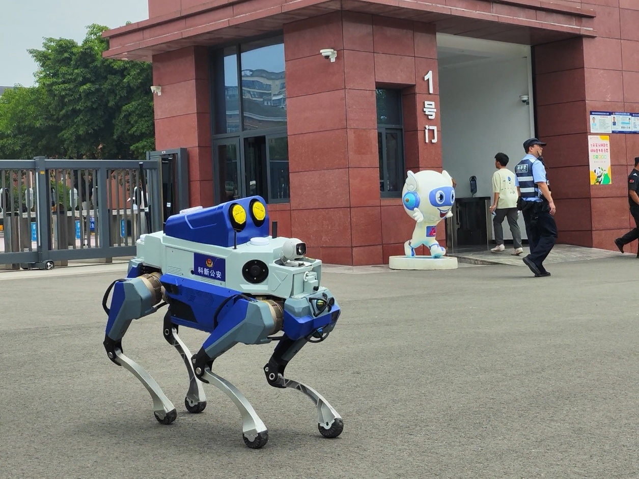 上午8时,在绵阳南山中学双语学校考点,一只印有“科新公安”字样、蓝灰相间的四足仿生机器狗“脚步”轻盈而稳健,正对考点周边进行安全巡逻。