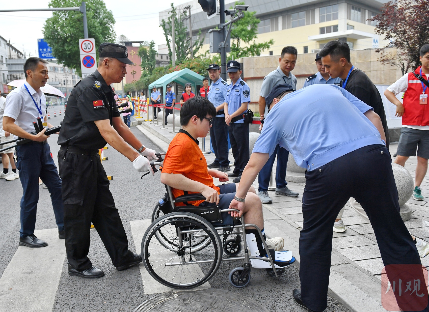 2025年6月8日,在四川省成都市中和中学考点门口,工作人员帮助一名行动不便的考生进考场。