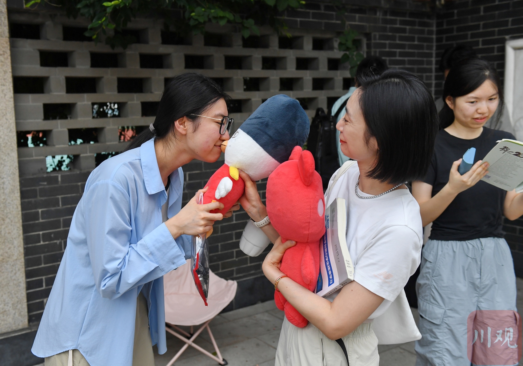 2025年6月8日,在四川省成都市中和中学考点门口,一名考生(右)走进考场前亲吻自己的玩偶。