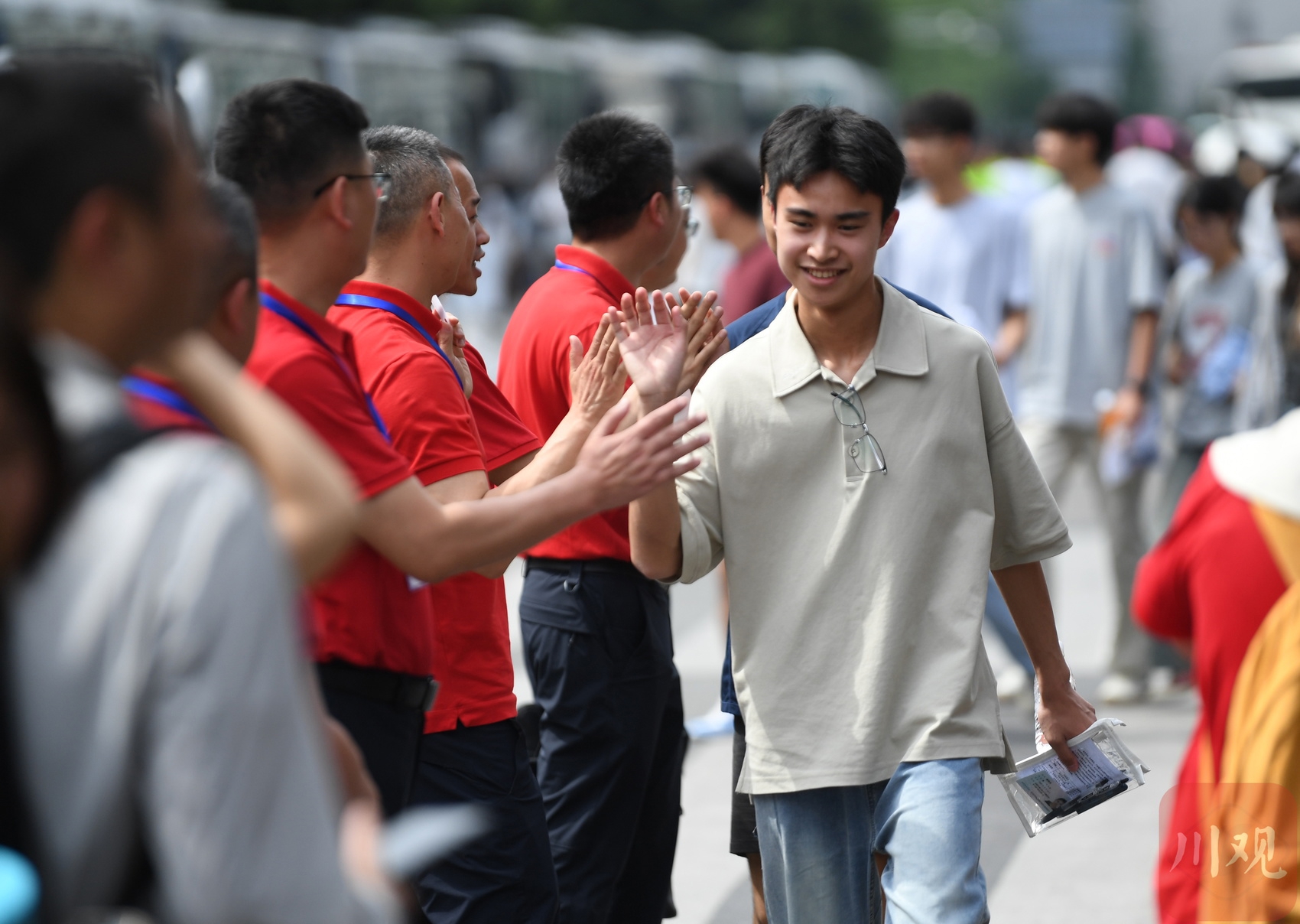 2025年6月8日,在位于四川天府新区华阳街道的华阳中学考点门口,老师排成队为考生击掌加油。