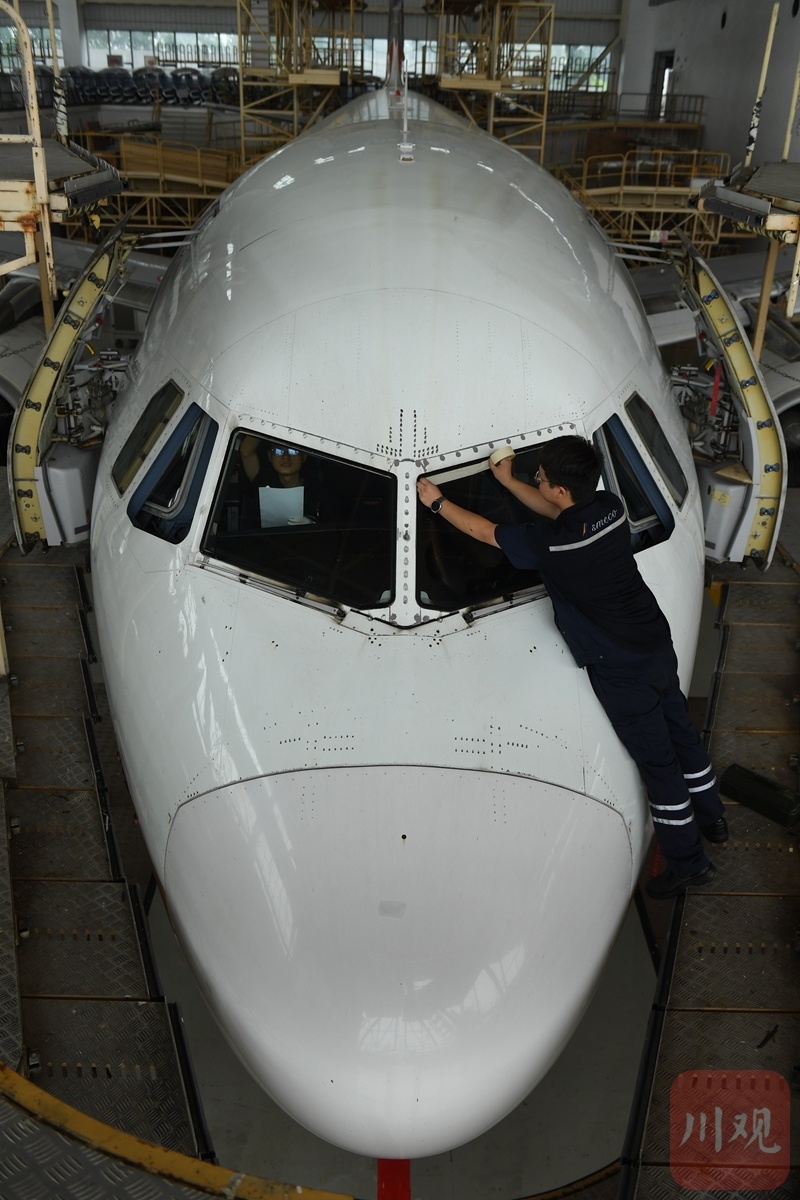 “再紧,再紧一点,好了!”6月5日傍晚,四川飞机维修工程有限公司(以下简称川维)的结构部钣金机械员马山江在位于成都市双流区西航港的公司机库里加班,为一架正在维修的空客A321飞机更换ADF天线支座的固定螺帽。马山江所在的川维,是集飞机保养、检修、结构改装、客改货、飞机拆解等多项业务于一体的西南地区重要航空维修基地,也被称作“飞机医院”。在川维双基地(成都双流国际机场基地和成都天府国际机场基地),目前在场共有11架飞机正在进行维修,其中3架处于定检维护阶段,6架正在进行深度检和大型结构检,还有2架客改货飞机正在进行改装。