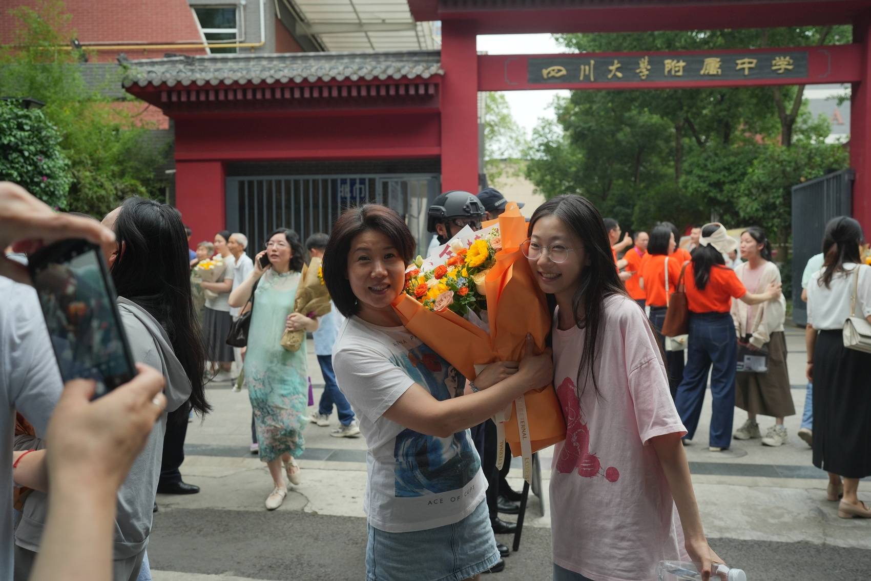 现场不少家长手捧鲜花和礼物,当看到考生们迈着轻快的步伐走出校门时,家长们迫不及待地迎上前拥抱,一幕幕暖心场景接连上演。川大附中高三年级的班主任们也早早等候在校门口,与考生们逐一击掌,共同庆祝高考顺利结束。