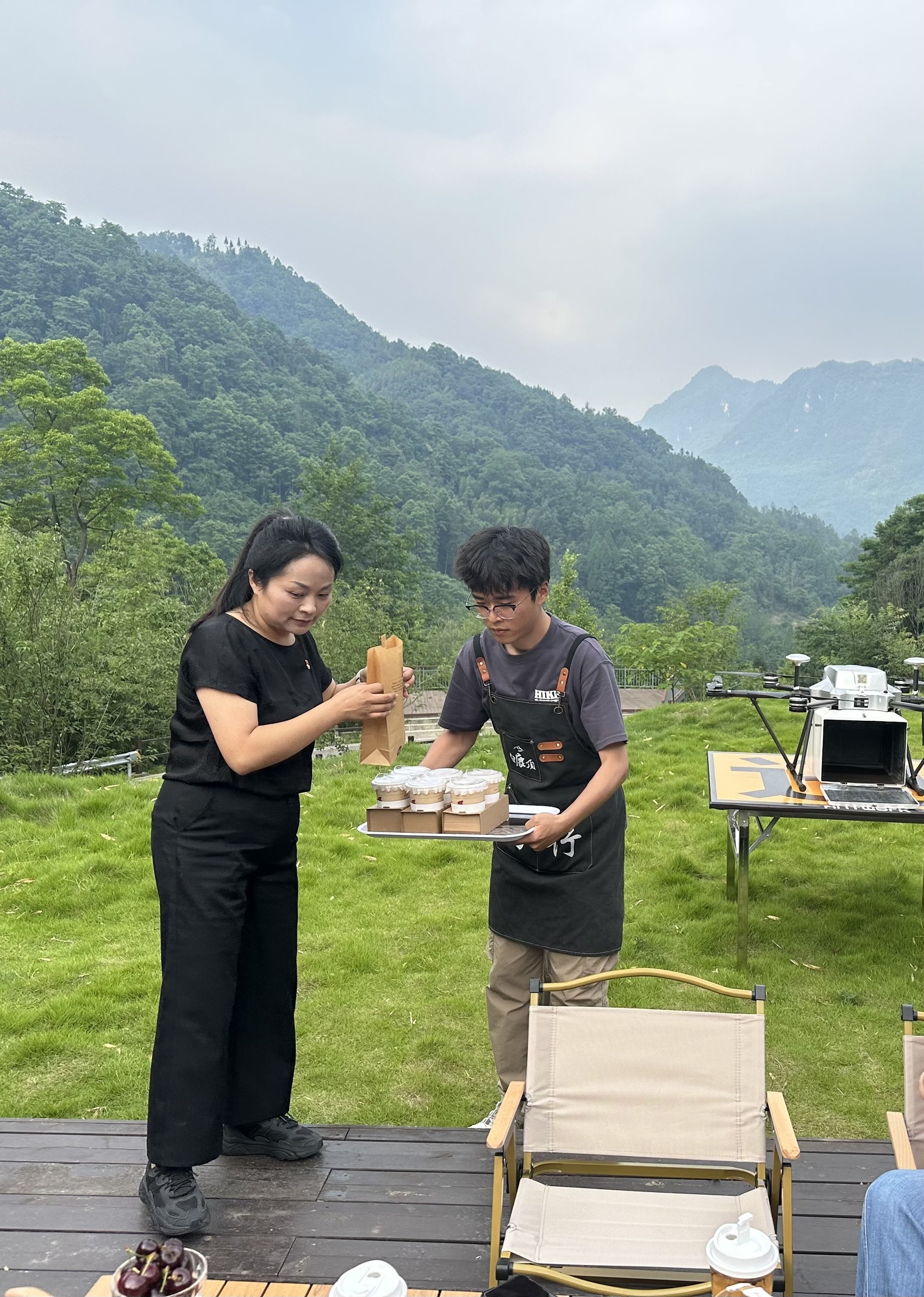 彭州市白鹿镇,通往白鹿顶村的生态栈道两侧,各色绣球花开得正艳。半山“野行”生态营地里,游客们闲适地聊着天。谈笑间,一架无人机降落在营地草坪上,三公里外咖啡店的热拿铁,就这样来到游客身边。
