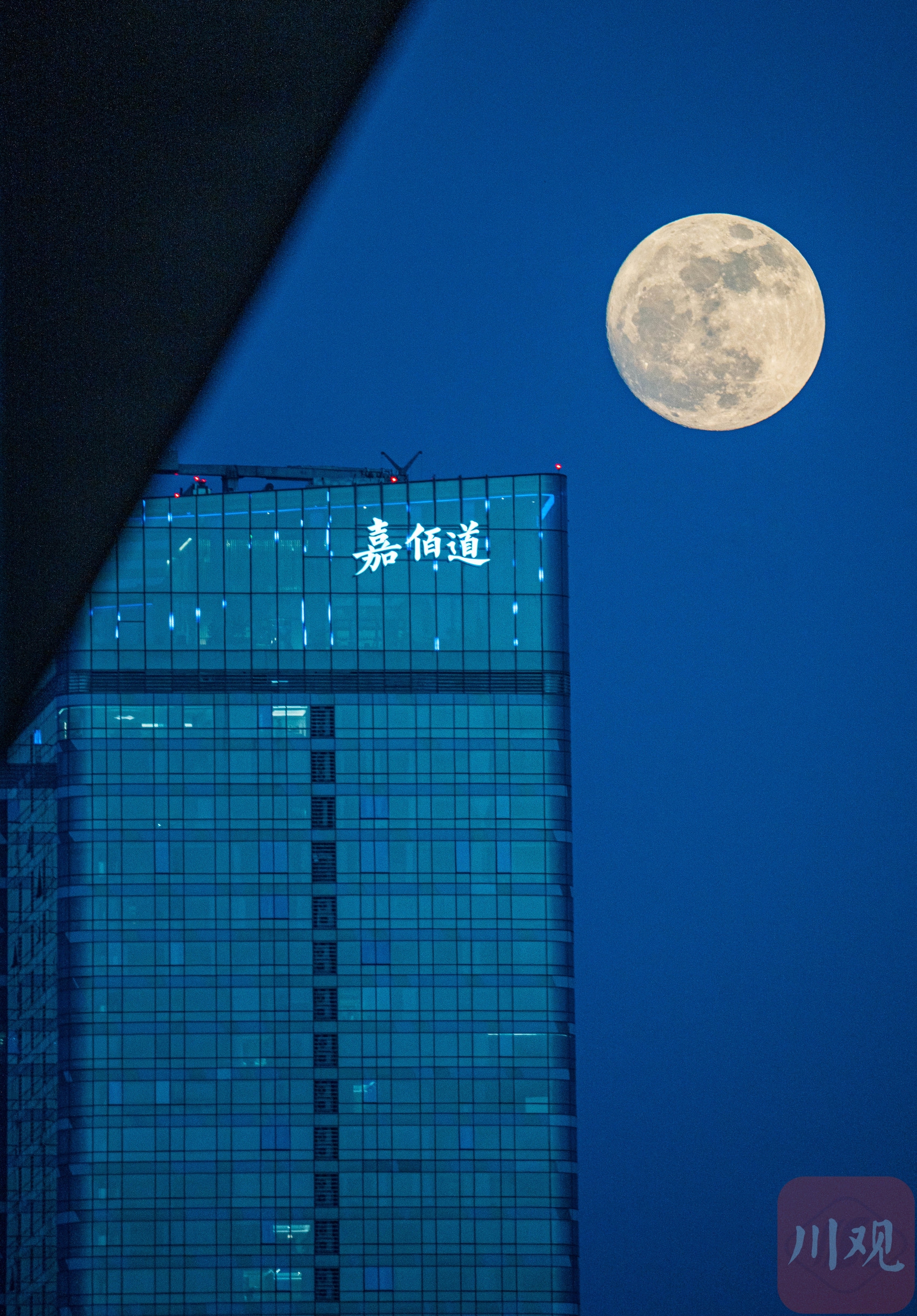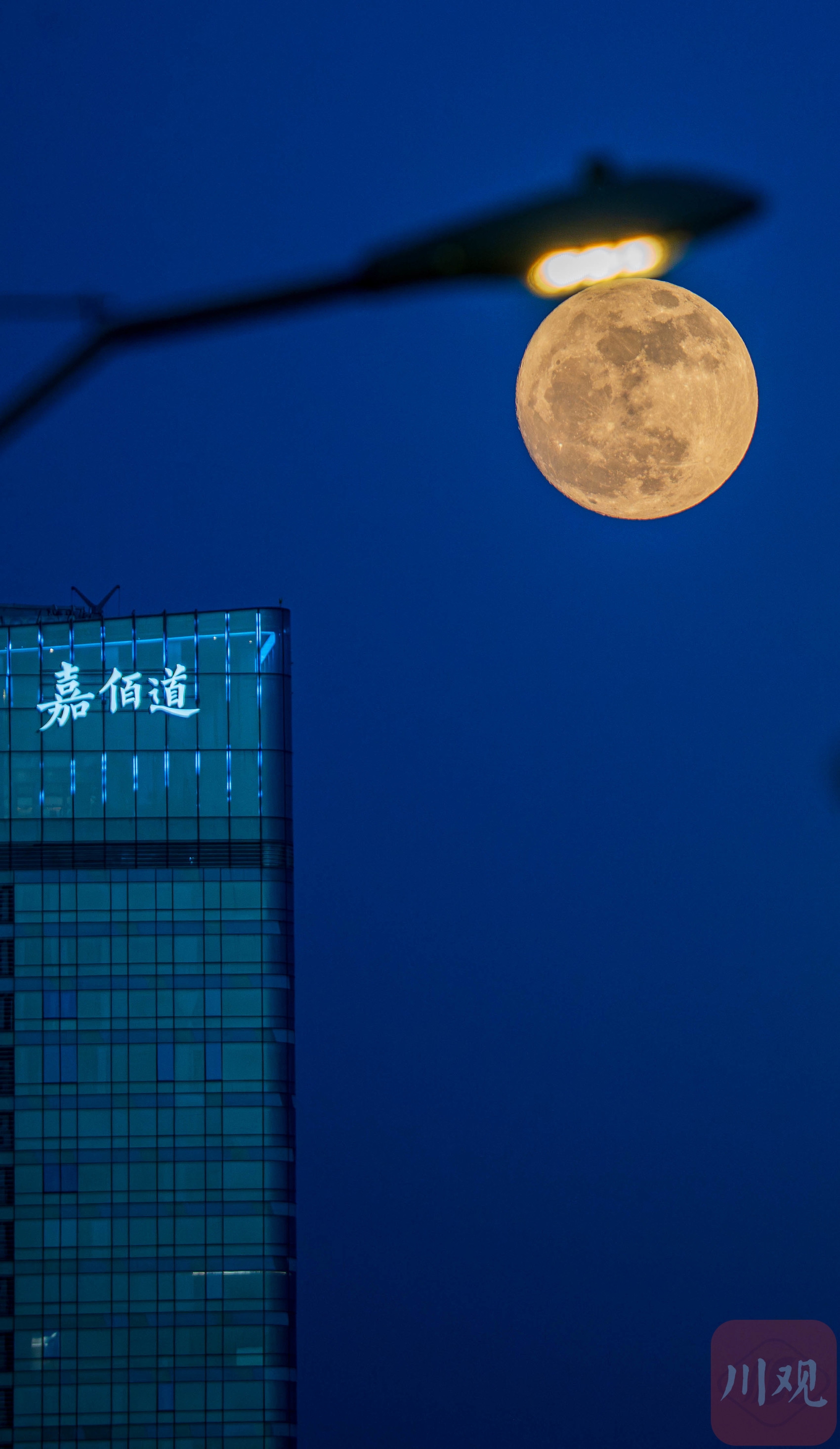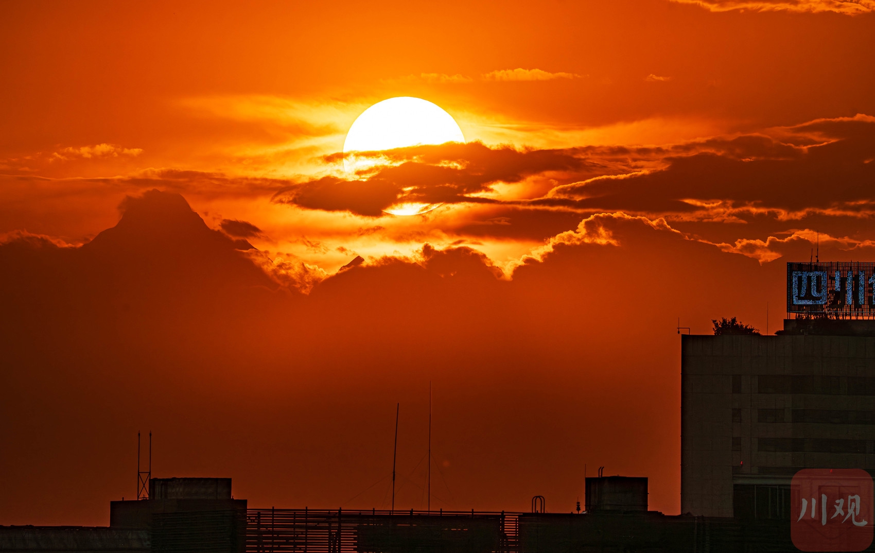 6月10日傍晚,成都西边的群山在日落时分清晰可见,太阳于100公里外的幺妹峰附近缓缓落下。与此同时,一轮圆月悄然升起在东边天空,悬于城市上空,将暮色中的美景推向高潮。
