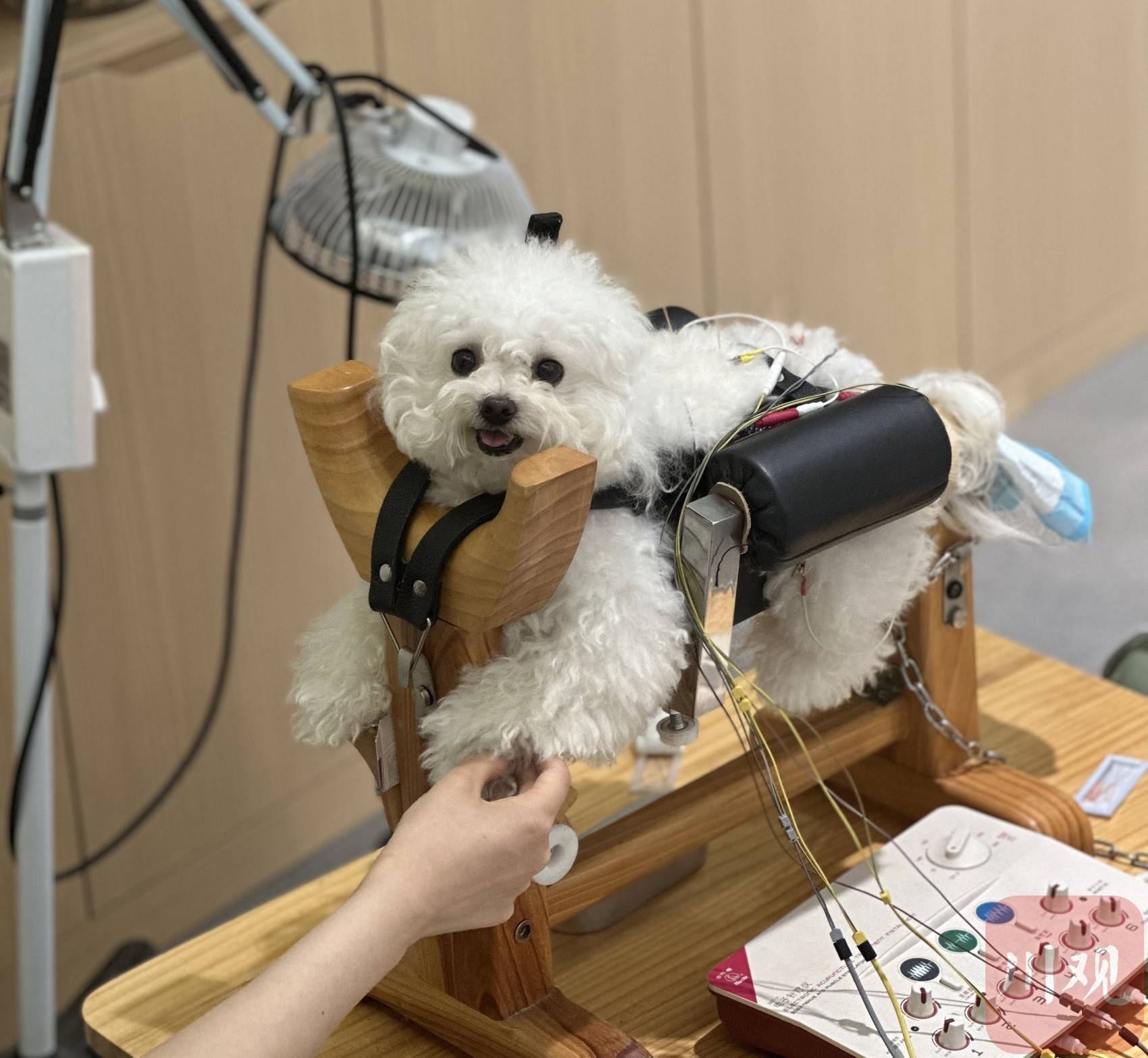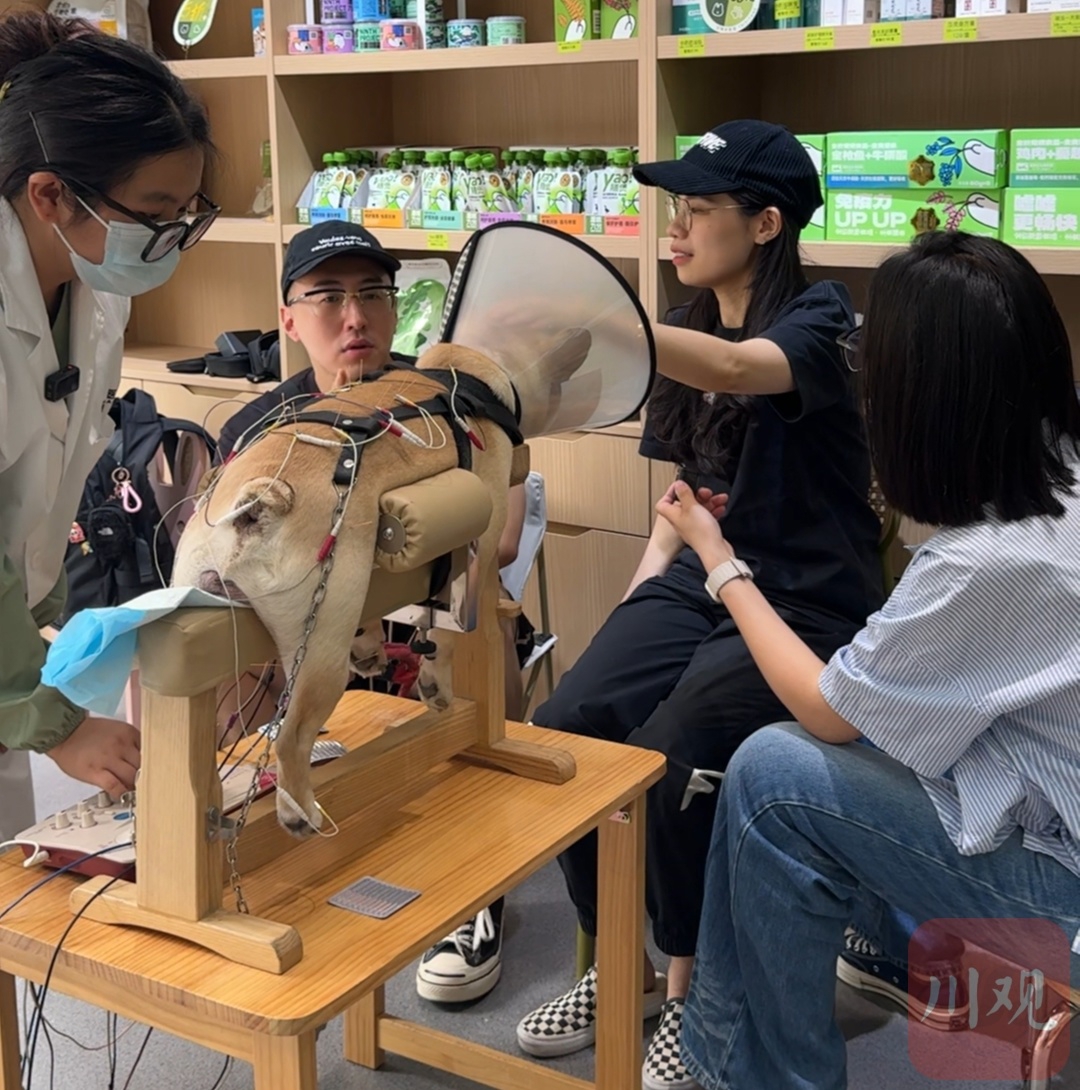 6月8日,我来到四川汪喵太颐堂动物医院管理有限责任公司旗下的汪喵太医堂武侯院区。走进医院内,一只小狗正准备扎针。“乖,别动。”主治医师邓旭蓉话音未落,指尖已在小狗的背部精准寻位,把细长的针灸针缓缓推入,再将电子针疗仪连接在针的尾部。在连通十多根针后,小狗还需要在诊疗架上等待电流持续刺激神经。