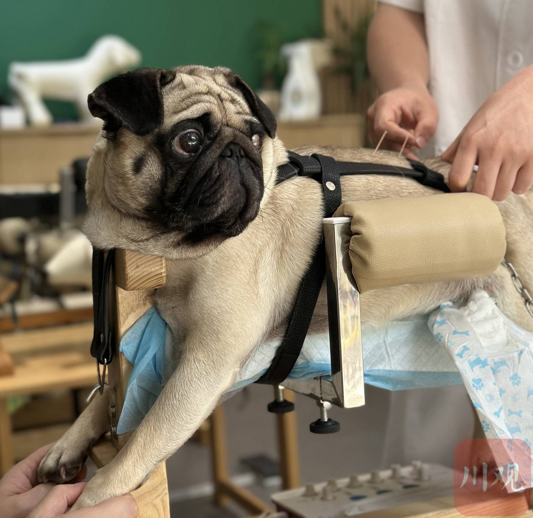 “我们狗狗是经过几次有点剧烈的运动后,脊椎神经炎犯了,忽然就走不了路。”市民王一啸在小红书上看到医院“针灸理疗”的宣传后就过来体验了,已经连续3天带着自家宠物来做针灸理疗,现在小狗基本能走路了。
