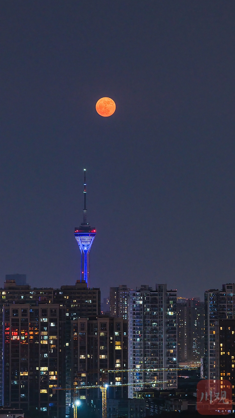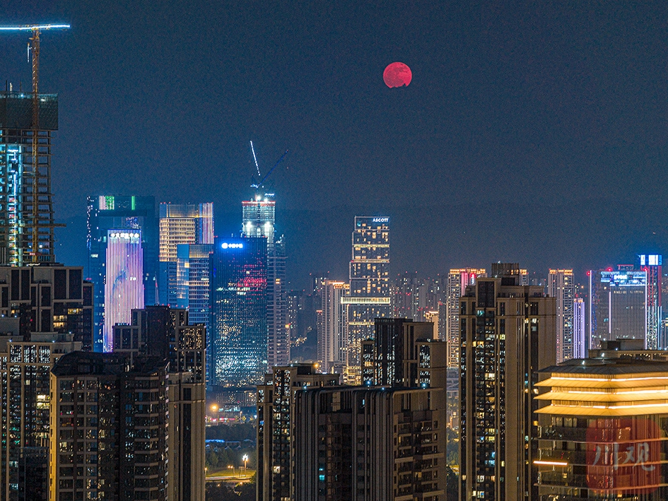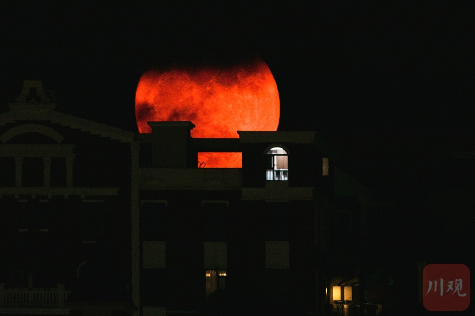 一轮红月爬上成都市夜空。C视觉签约摄影师 彭涛
