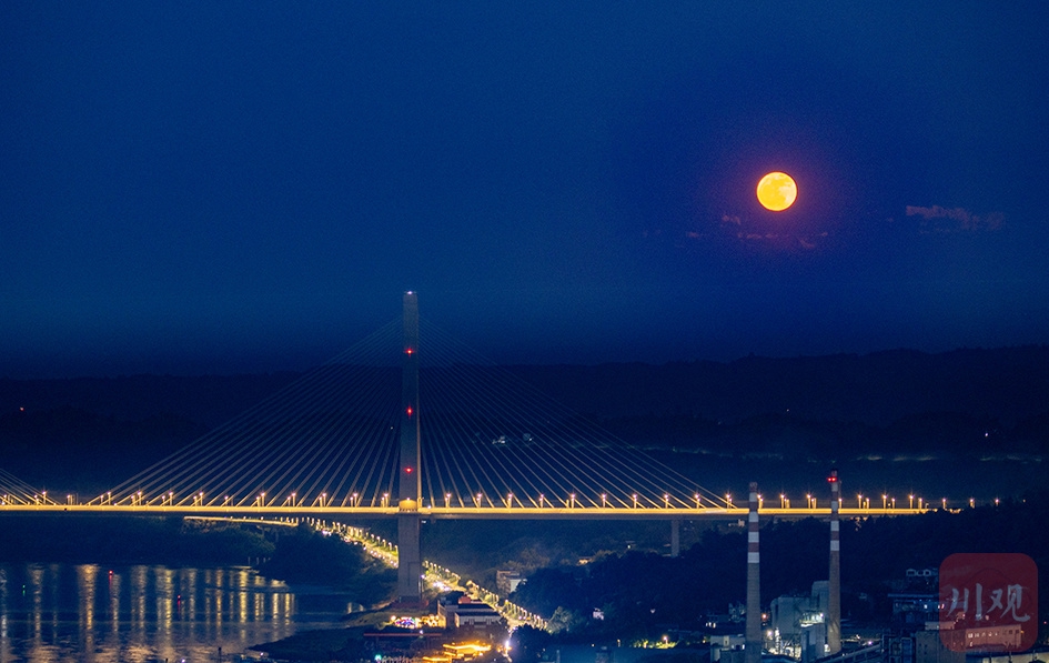 一轮满月悬挂在宜宾市三江新区临港公铁两用长江大桥上。C视觉签约摄影师 彭珉翔