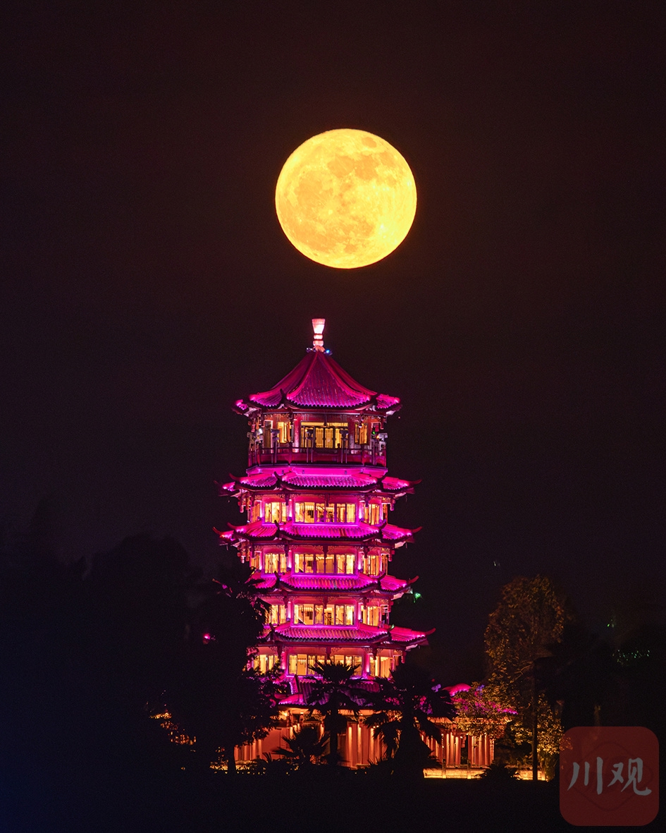 广安奎阁塔与本年度“最低满月”同框。C视觉签约摄影师 范聪