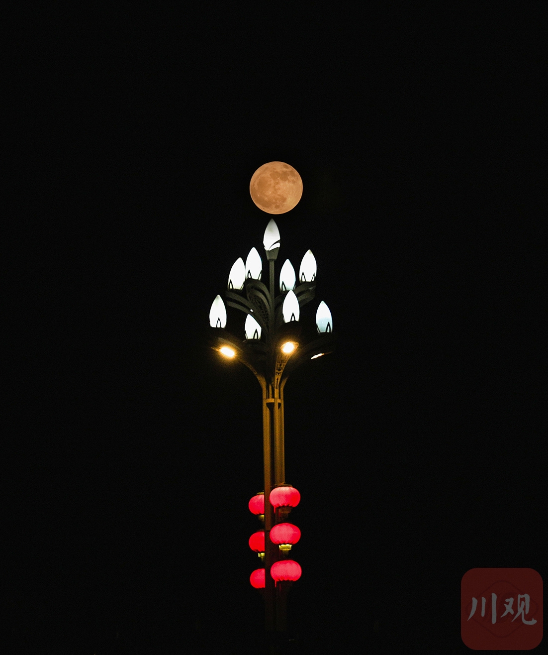 从20时许开始,成都、绵阳、宜宾、泸州、眉山等地的摄影师陆续记录下"最低满月"的绝美画面。在成都,满月自龙泉山巅缓缓升起,与都市霓虹交相辉映;绵阳的夜空中,银盘般的满月高悬城市之上,倾洒粼粼清辉;眉山的镜头则定格了满月与古建同框的画面,传统气韵与天文奇观相映成趣,别具意境。