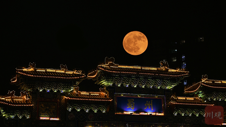 崇州地标唐人街东湖东阁与本年度“最低满月”同框。C视觉签约摄影师 郭迎伟