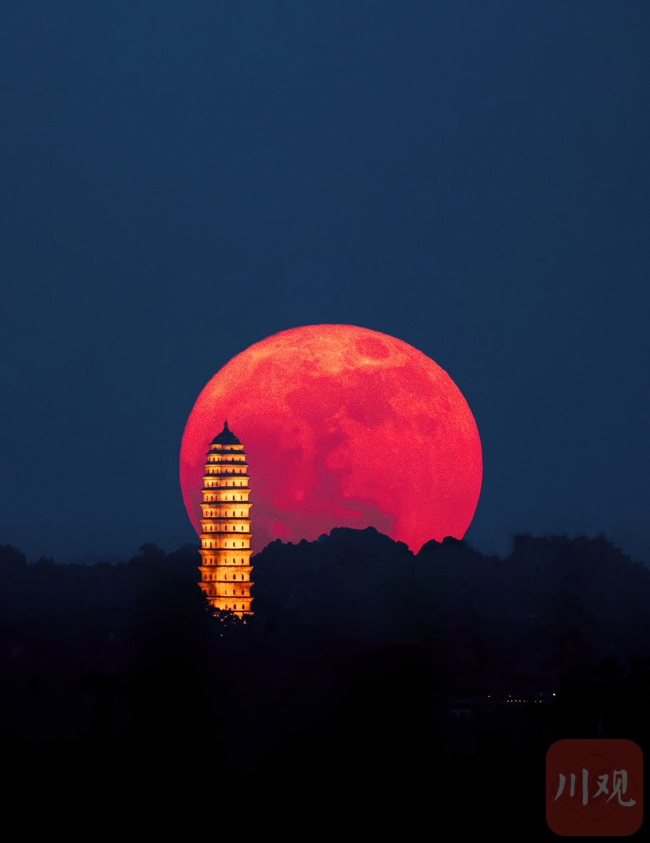 眉山市东坡区,一轮超级红月亮穿过大旺寺白塔,非常壮观。C视觉签约摄影师 张翔升