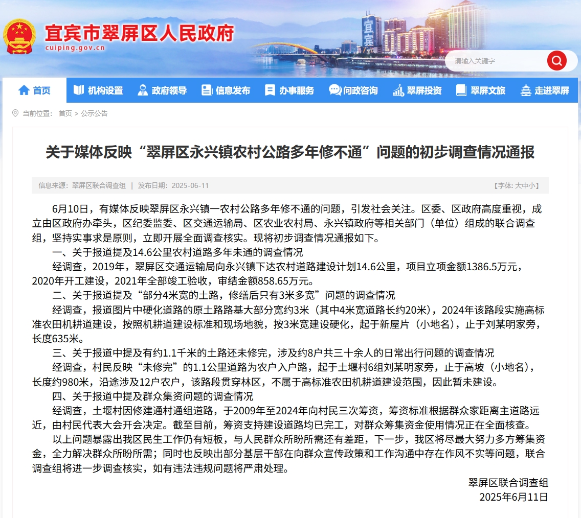 6月11日,宜宾市翠屏区政府官方网站上发布了《关于媒体反映“翠屏区永兴镇农村公路多年修不通”问题的初步调查情况通报》。全文如下: