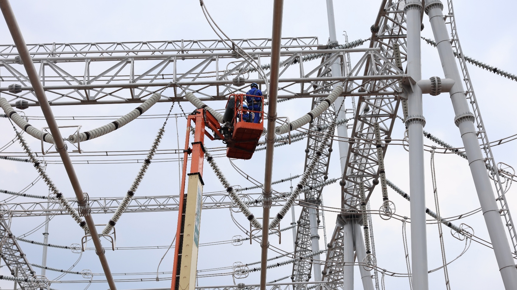 眉山西500千伏变电站新建工程施工人员正在进行管母线消缺工作。(李晨萌 摄)