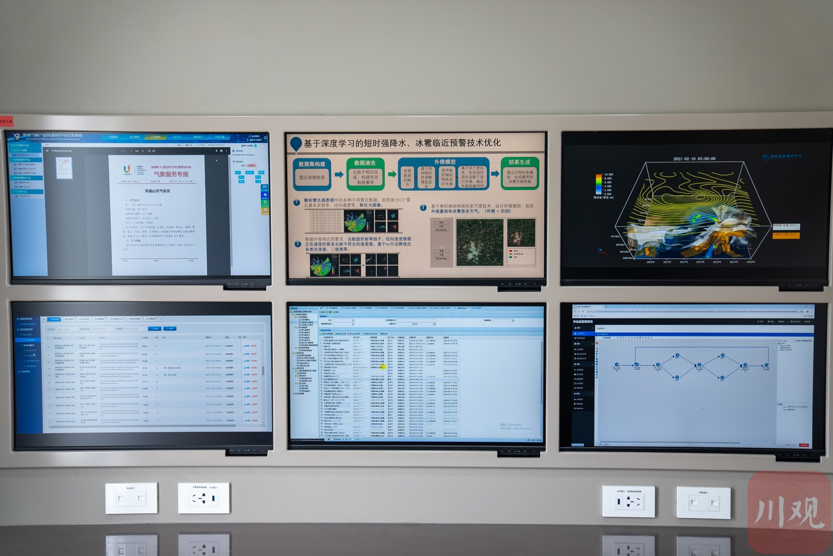 在“人影车”的“肚子”里面,是安装监测设备的地方,通过架梯步入车里,能看到前后都是显示屏,其上各类数据非常丰富。雷达、无人机等探测仪器传回的数据,就显示在这里,系统会进行梳理、分析,再将结果传输给需要的终端。所以,这台“人影车”不仅是“侦察兵”,也是一个“中央厨房”。