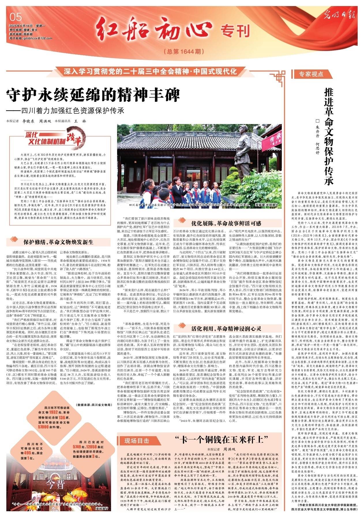 党的二十届三中全会提出,“弘扬革命文化”“推动全社会崇尚英雄、缅怀先烈、争做先锋”。近年来,四川出台《四川省红色资源保护传承条例》及其配套实施办法,建立省、市、县三级联席会议机制和革命文物保护利用治理体系,建立红色文化资源数据库,不断加强文物保护和研究阐释,使革命文物资源成为传承红色基因、赓续红色血脉的不竭源泉。