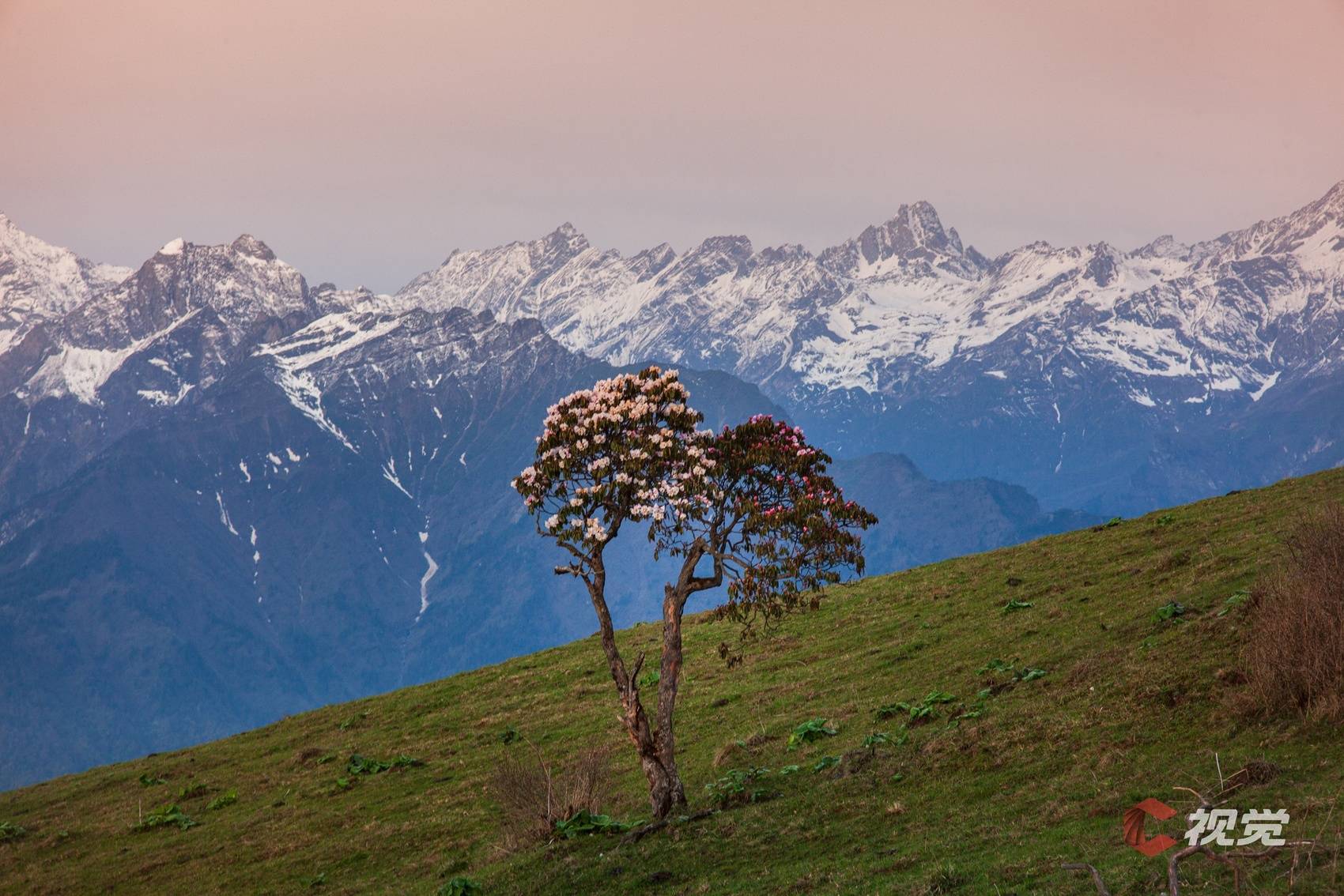 绵阳市平武县虎牙藏族乡占口村磨子坪,一株高山杜鹃与巍峨雪山同框。C视觉签约摄影师 田维兵