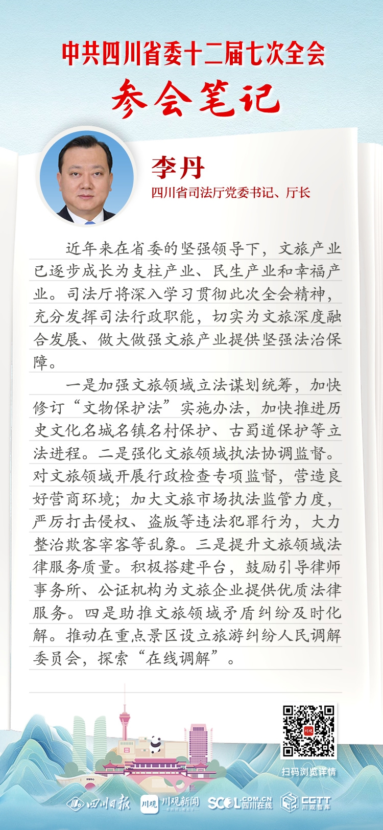 近年来在省委的坚强领导下,文旅产业已逐步成长为支柱产业、民生产业和幸福产业。司法厅将深入学习贯彻此次全会精神,充分发挥司法行政职能,切实为文旅深度融合发展、做大做强文旅产业提供坚强法治保障。