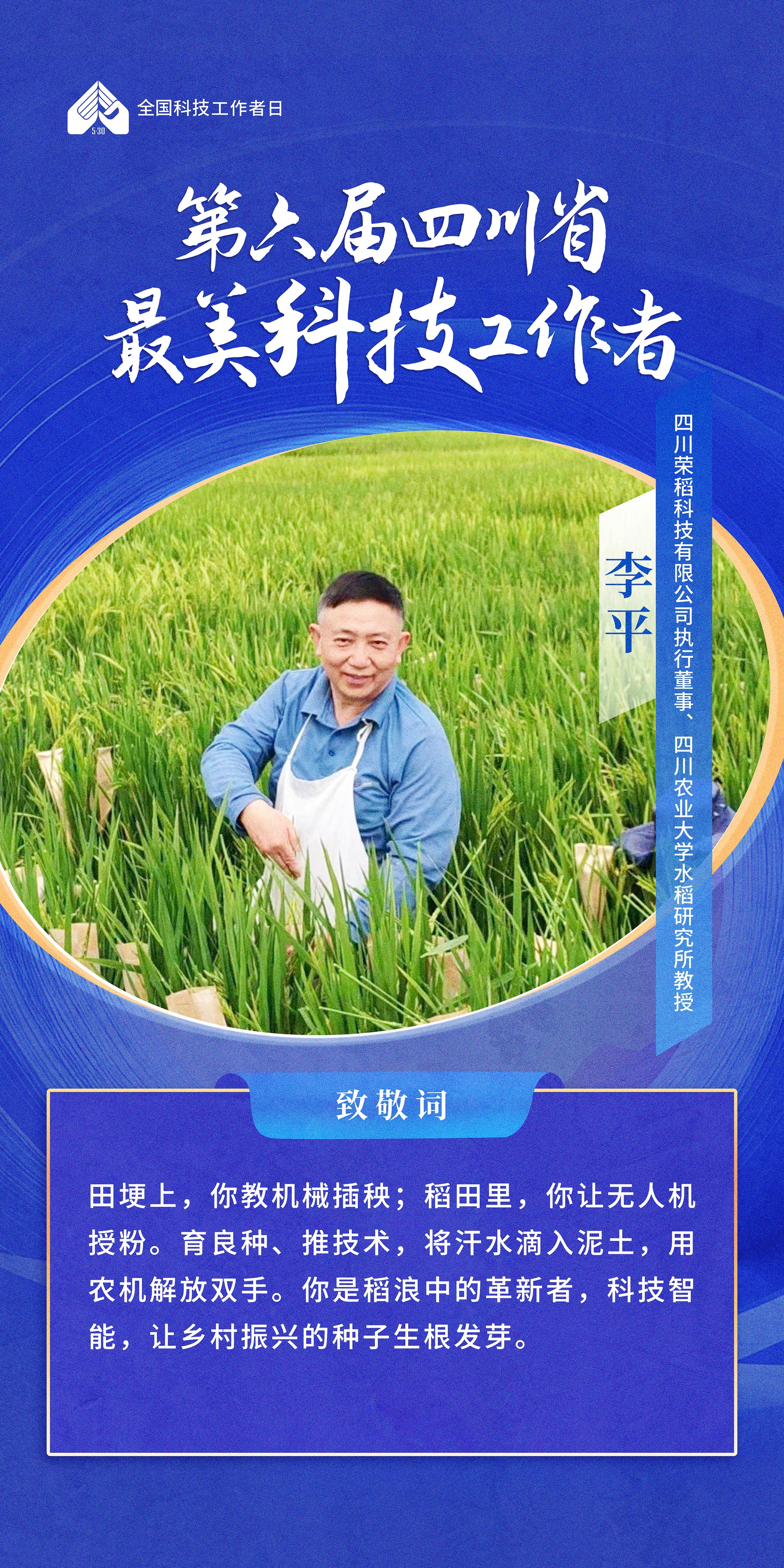 李平现任四川农业大学教授、博士生导师,主要从事水稻遗传育种研究。1989年,他硕士毕业后留校水稻研究所工作,从事水稻生物技术育种工作。时任水稻所所长周开达告诫李平:“书本知识已经读得差不多了,接下来要念的是‘大田之书’。” 后来,李平成为了周开达院士的博士,对读懂“大田之书”的理解更加深刻。