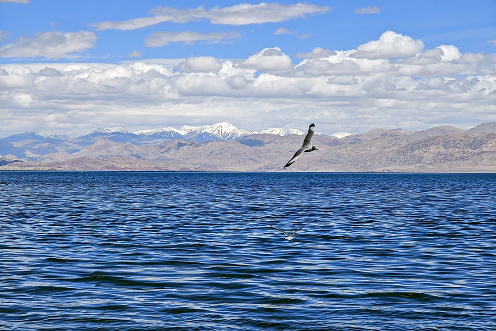 班公湖上飞翔的鸟儿(6月15日摄,无人机照片)。新华网 旦增努布 摄