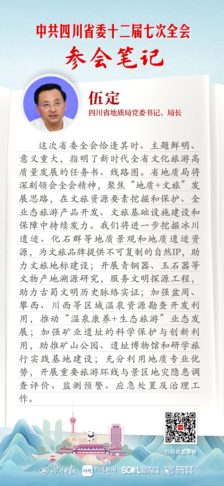 这次省委全会恰逢其时、主题鲜明、意义重大,指明了新时代全省文化旅游高质量发展的任务书、线路图。省地质局将深刻领会全会精神,聚焦“地质+文旅”发展思路,在文旅资源要素挖掘和保护、全业态旅游产品开发、文旅基础设施建设和保障中持续发力。我们将进一步挖掘冰川遗迹、化石群等地质景观和地质遗迹资源,为文旅品牌提供不可复制的自然IP,助力文旅地标建设;开展青铜器、玉石器等文物产地溯源研究,服务文明探源工程,助力古蜀文明历史脉络实证;加强盆周、攀西、川西等区域温泉资源勘查开发利用,推动“温泉康养+生态旅游”业态发展;加强矿业遗址的科学保护与创新利用,助推矿山公园、遗址博物馆和研学旅行实践基地建设;充分利用地质专业优势,开展重要旅游环线与景区地灾隐患调查评价、监测预警、应急处置及治理工作。
