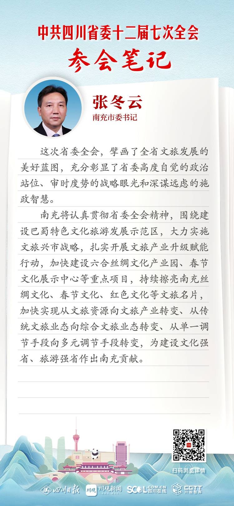 南充将认真贯彻省委全会精神,围绕建设巴蜀特色文化旅游发展示范区,大力实施文旅兴市战略,扎实开展文旅产业升级赋能行动,加快建设六合丝绸文化产业园、春节文化展示中心等重点项目,持续擦亮南充丝绸文化、春节文化、红色文化等文旅名片,加快实现从文旅资源向文旅产业转变、从传统文旅业态向综合文旅业态转变、从单一调节手段向多元调节手段转变,为建设文化强省、旅游强省作出南充贡献。