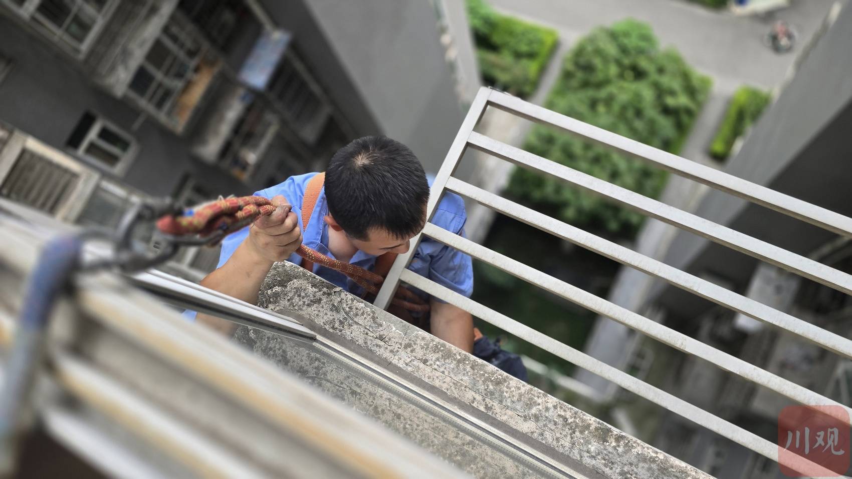 38摄氏度的成都街头,体感温度已超40摄氏度。安全绳系在腰间,来自四川长虹快益点电器服务有限公司成都分公司的36岁空调工程师胡绍辉悬在10层高楼外墙上,空调外机壳被晒得发烫,汗珠滴落瞬间蒸发。