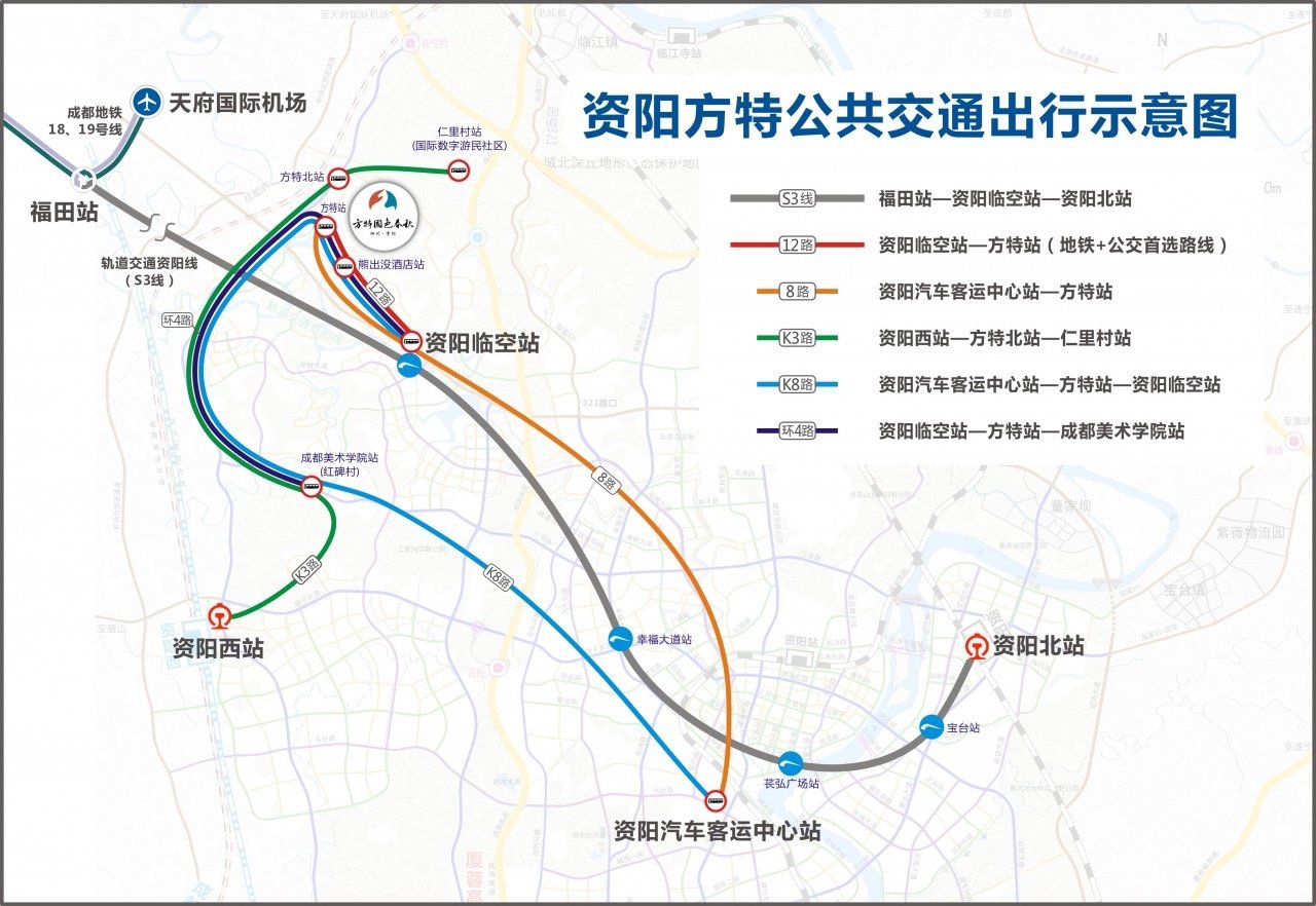 成都游客可乘轨道交通资阳线至资阳临空站,换乘公交专线或共享单车直达园区;高铁游客通过成渝高铁、成自宜高铁抵达资阳后,可无缝衔接公交或轨交;乘飞机的旅客从天府国际机场转乘地铁至福田站,换乘轨道交通资阳线10余分钟即达。