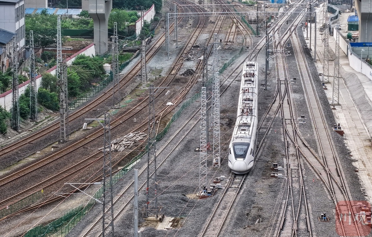 2025年6月20日7点09分,0S5081次列车平稳驶过成都站,标志着此次施工交替工作顺利完成。(画面左侧为老铁路线,右侧为新铁路线)
