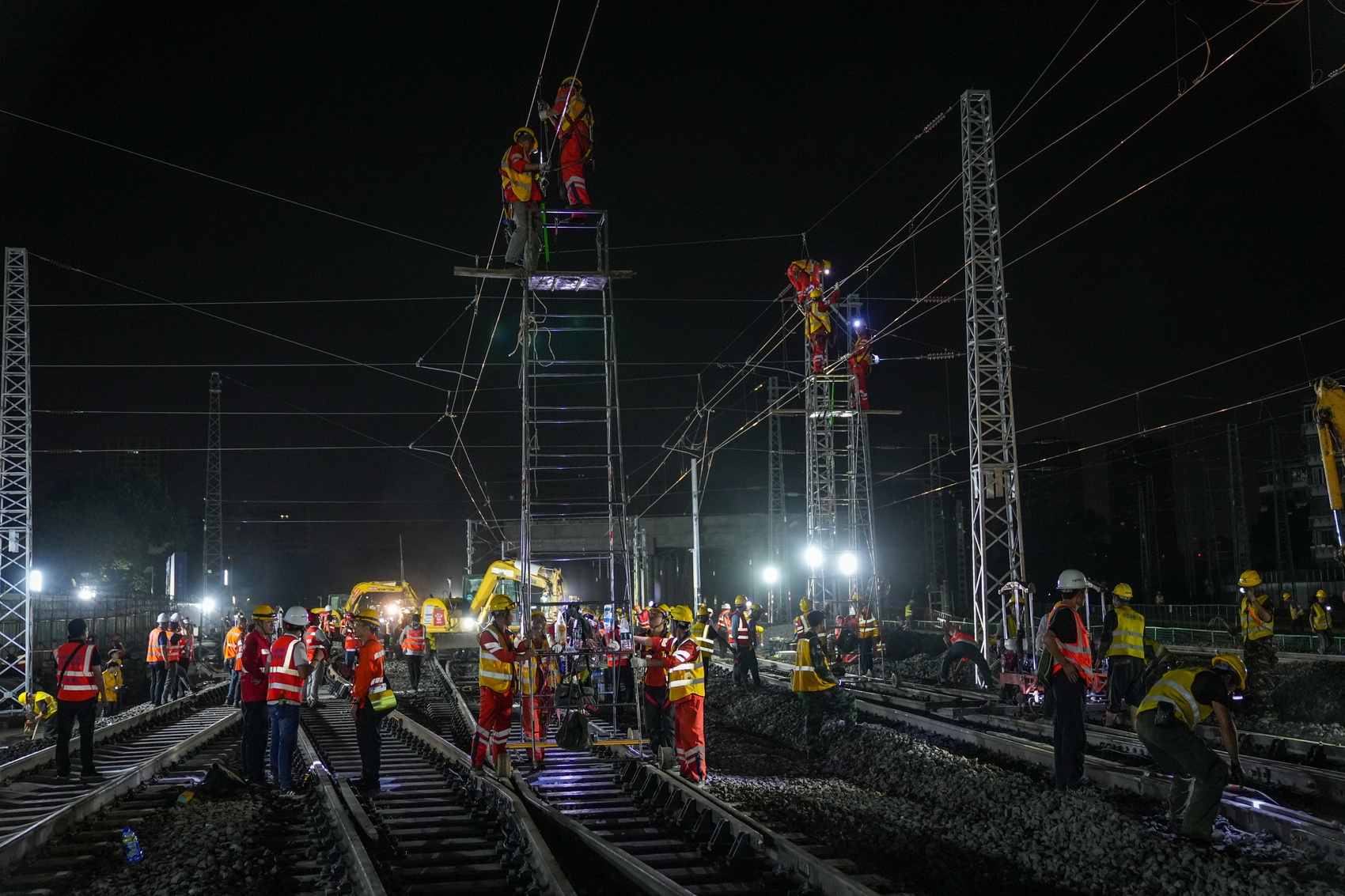 空中的电线施工难度最大。“我们的误差是毫米级的,基本要和铁轨垂直对接。”中铁电气化局成渝中线铁路(成都站改建)项目部项目经理杨旺介绍,在极短的铁路“天窗”停电时间内,需要克服高空作业风险,精准对接,基本没有重来的机会,项目团队运用先进设备和数字技术进行精确施工,确保工程一次成型、一次成优。
