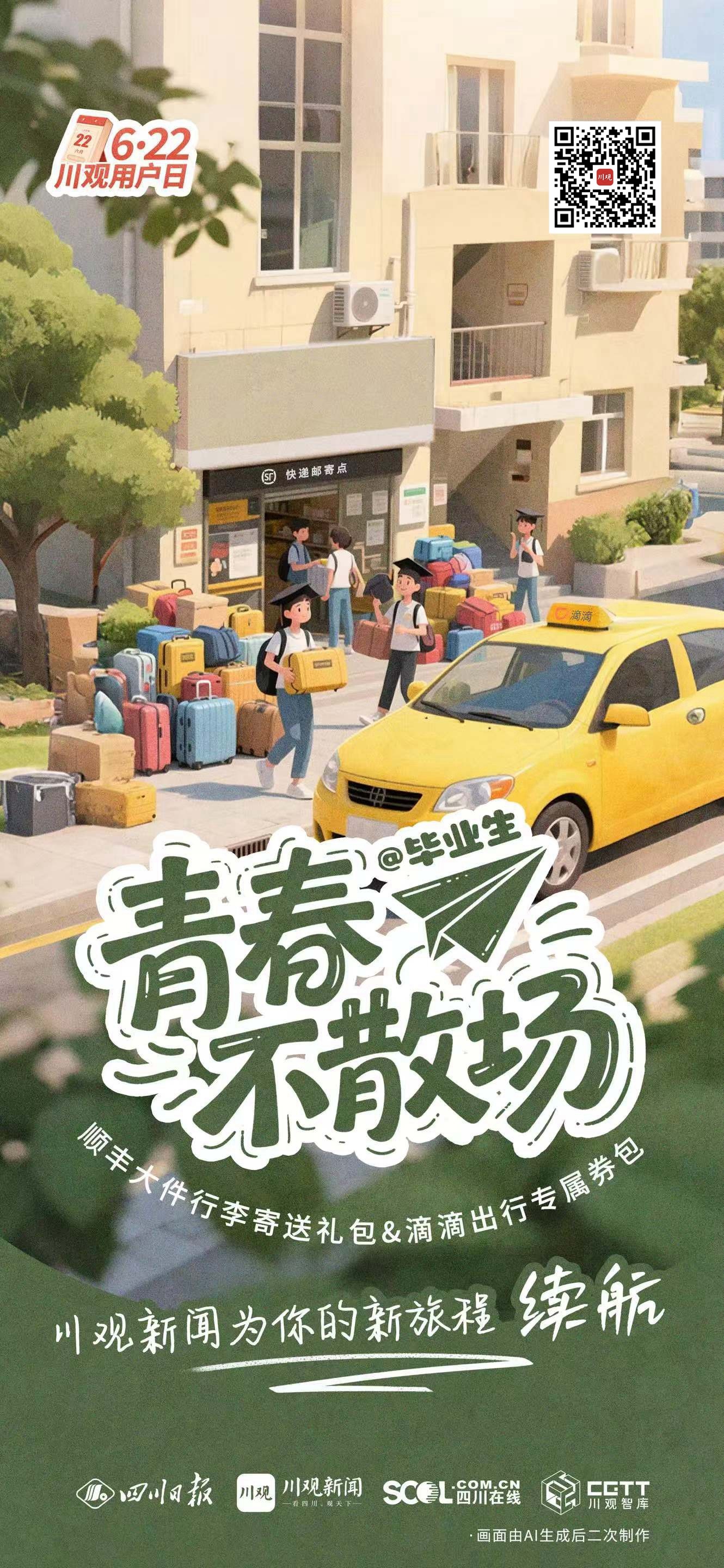 6月22日—29日,川观新闻携手顺丰、滴滴,为每一位毕业生准备了一份实用的“毕业礼包”:滴滴出行专属券包、顺丰大件行李寄送礼包——打车不心疼,也不当“搬运特种兵”,直接给你的新旅程续满能量条!