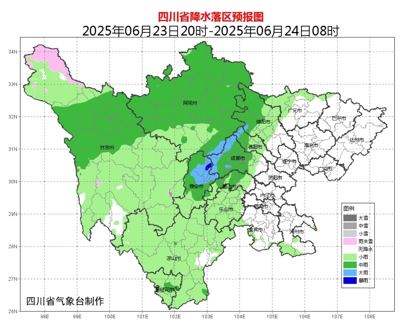 6月24日白天到晚上,盆地大部阴天有阵雨或雷雨,雨量普遍中到大雨,其中广元、绵阳、德阳、成都、眉山、南充、遂宁、资阳8市有暴雨,个别大暴雨;川西高原和攀西地区阴天有阵雨或雷雨,雨量普遍小到中雨,其中阿坝州东部和凉山州北部有大雨,局部暴雨。