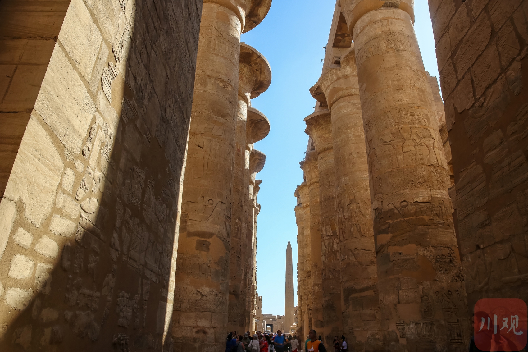 卡纳克神庙多柱厅,巨型石柱林立,柱身刻满象形文字,尽头方尖碑直刺蓝天,游客穿梭于历史与光影间 。