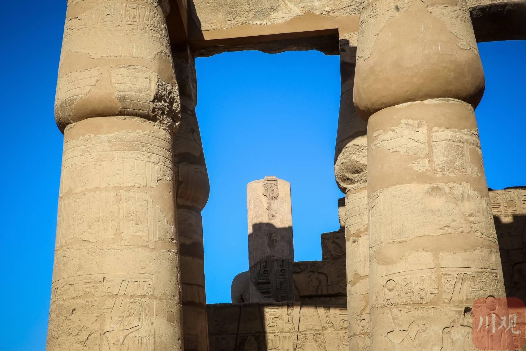卡纳克神庙遗址,古老石柱携象形文字,框出蓝天与残垣。