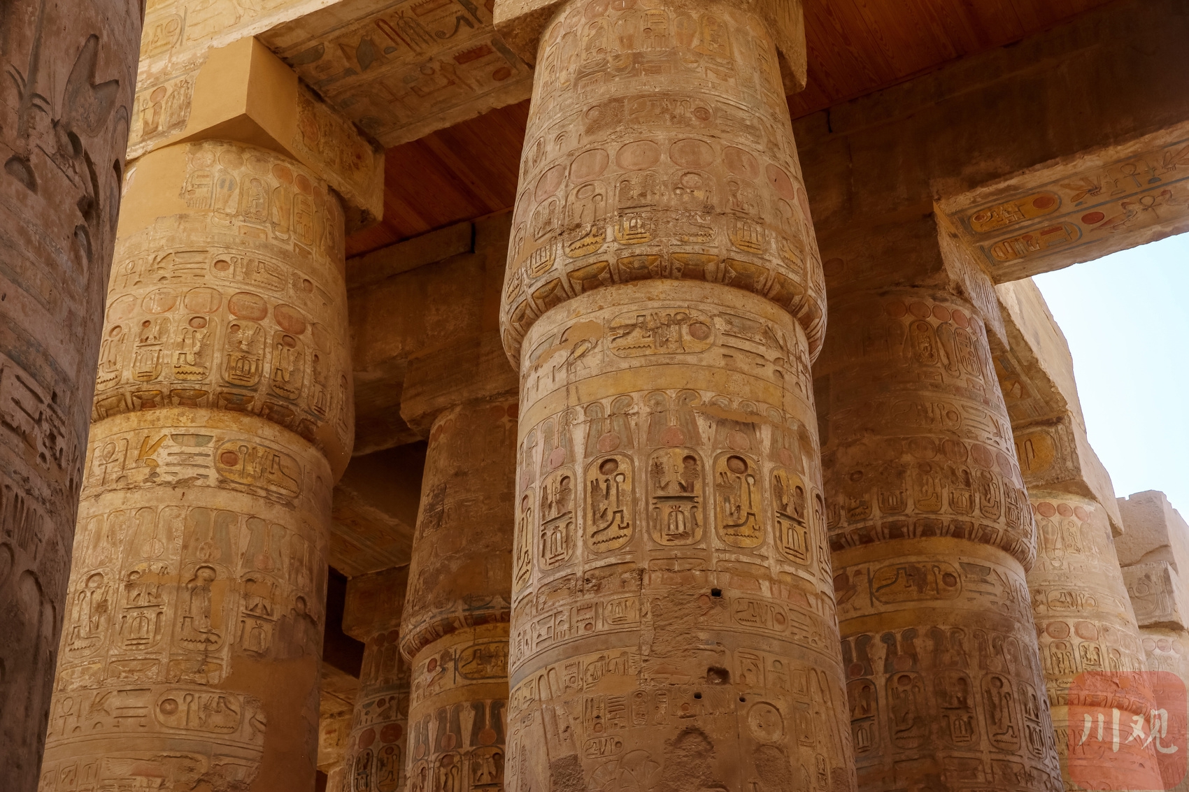 卡纳克神庙巨型石柱,周身布满象形文字与彩绘。