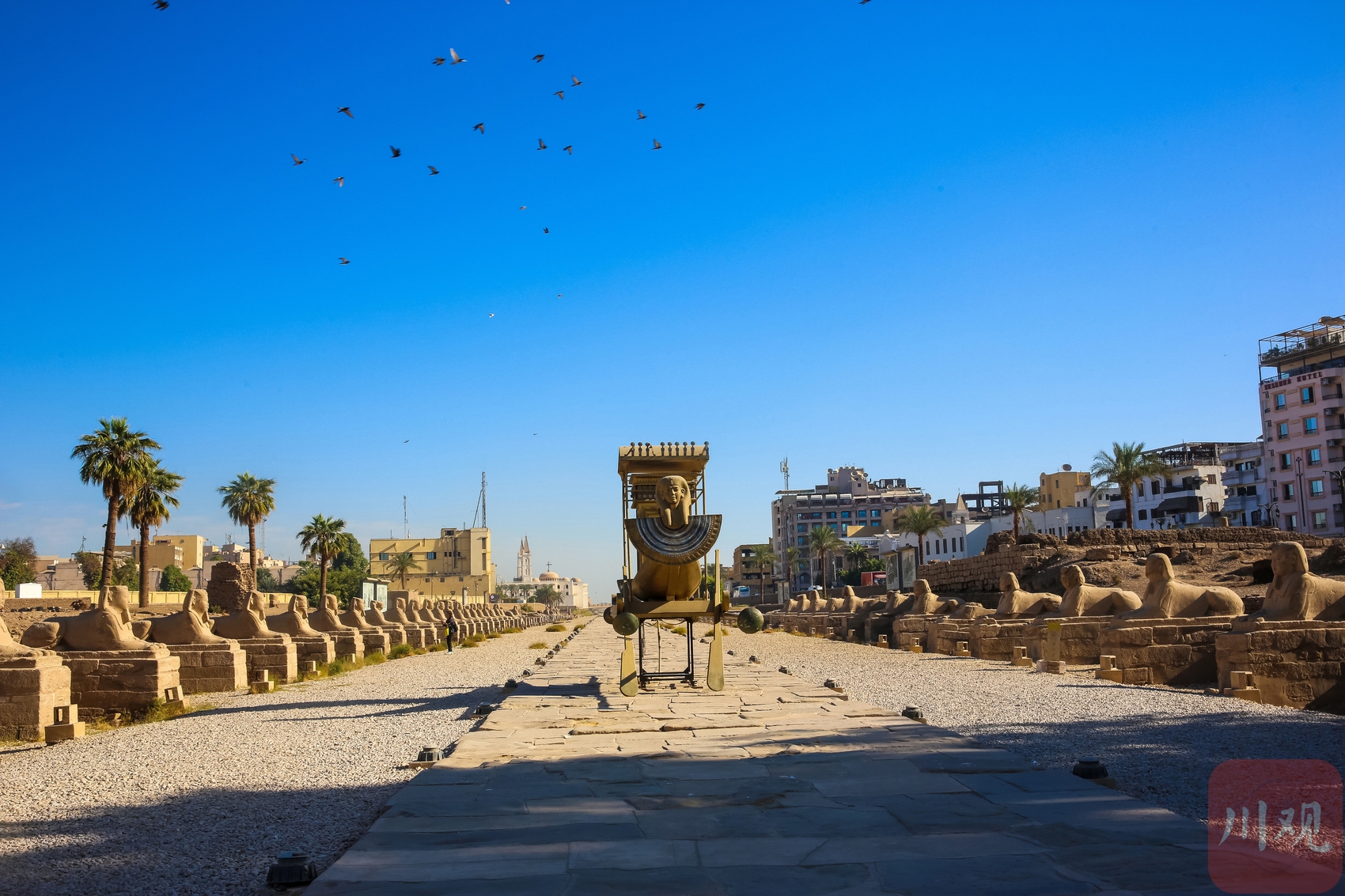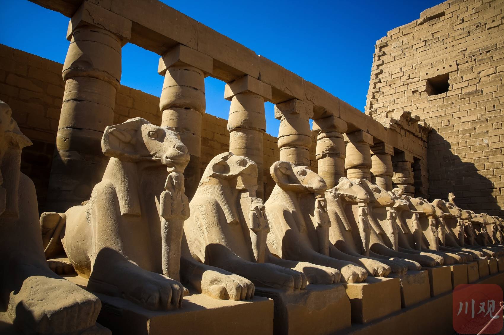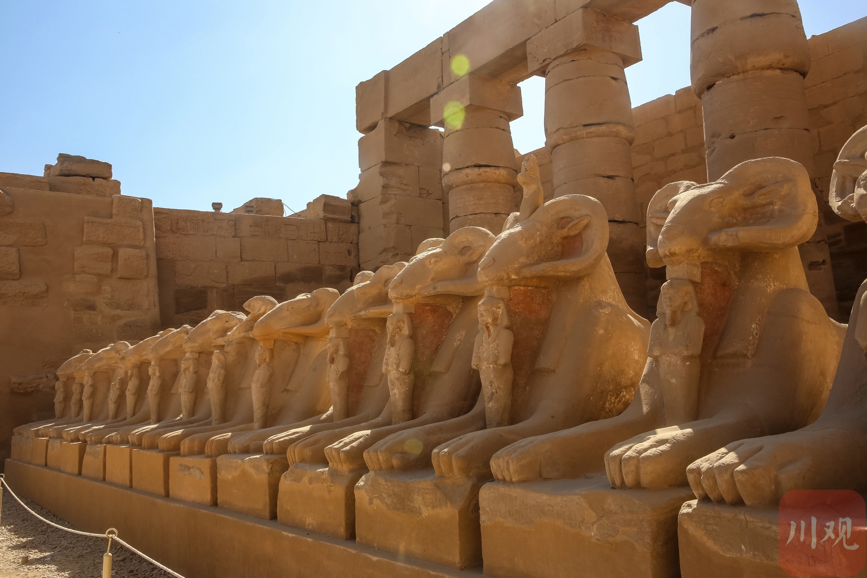 卡纳克神庙的公羊狮身雕像群,在日光下整齐排列,古老石雕与残垣相互呼应 。