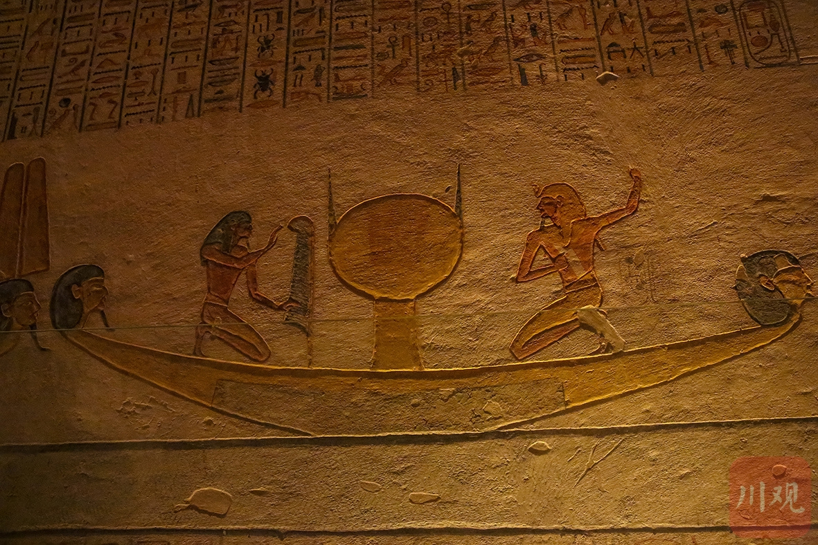 古埃及墓室壁画中,神船场景浮现,人物姿态鲜活生动,象形文字和彩绘相互交织 。