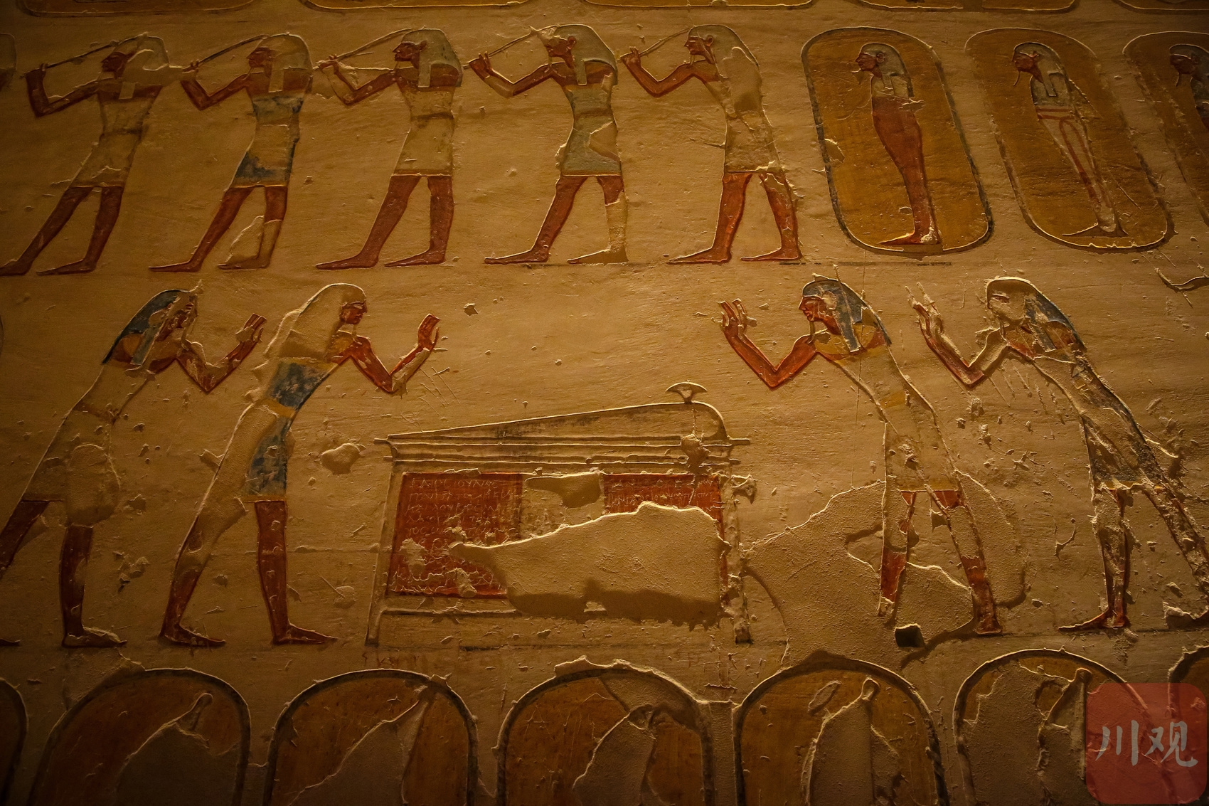 古埃及墓室壁画,绘有祭祀场景,人物神态鲜明,象形文字与色彩留存,传递千年宗教与生活信息 。
