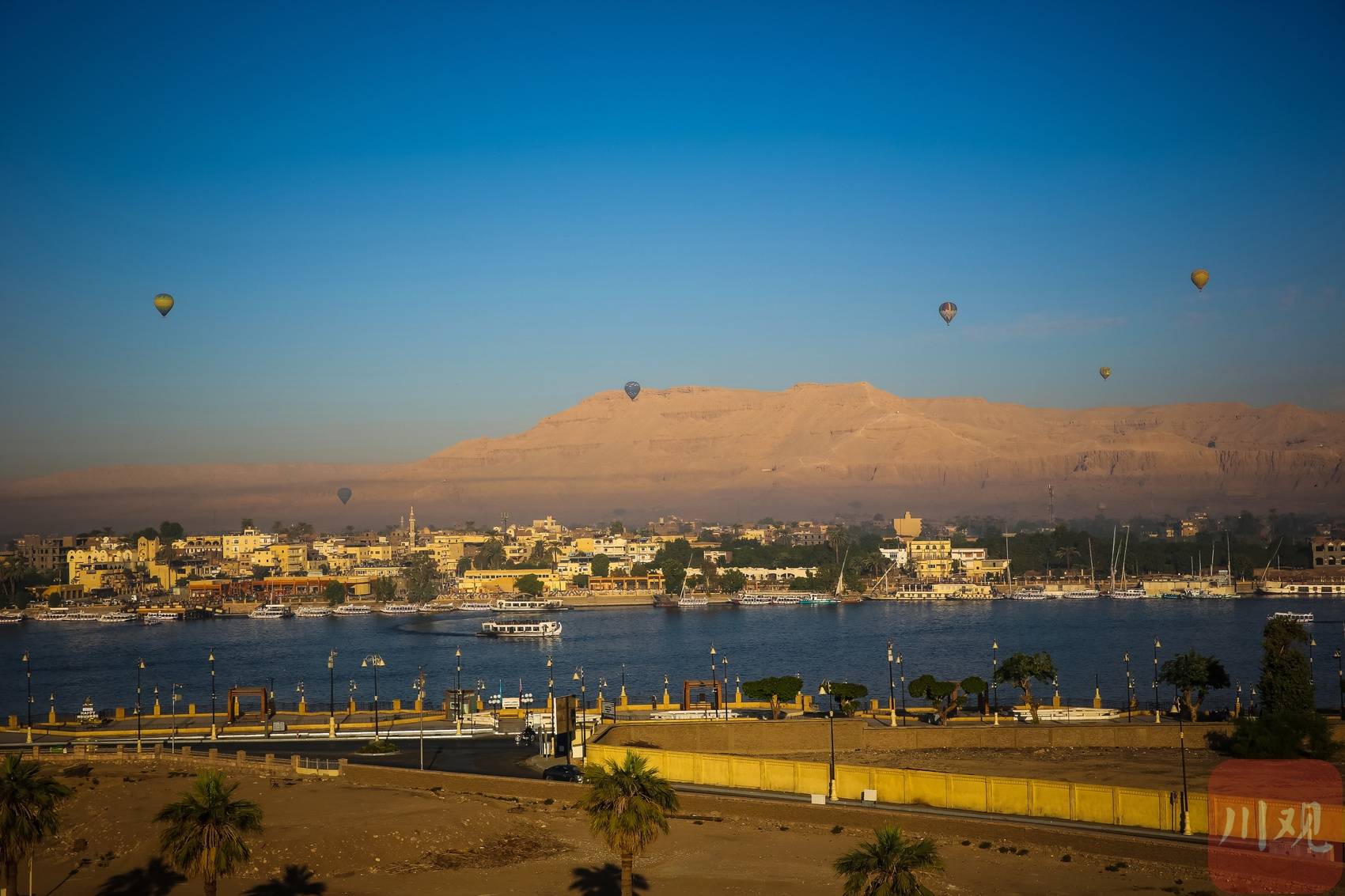 帝王谷外,游人乘坐热气球或游船在尼罗河上欣赏风景。