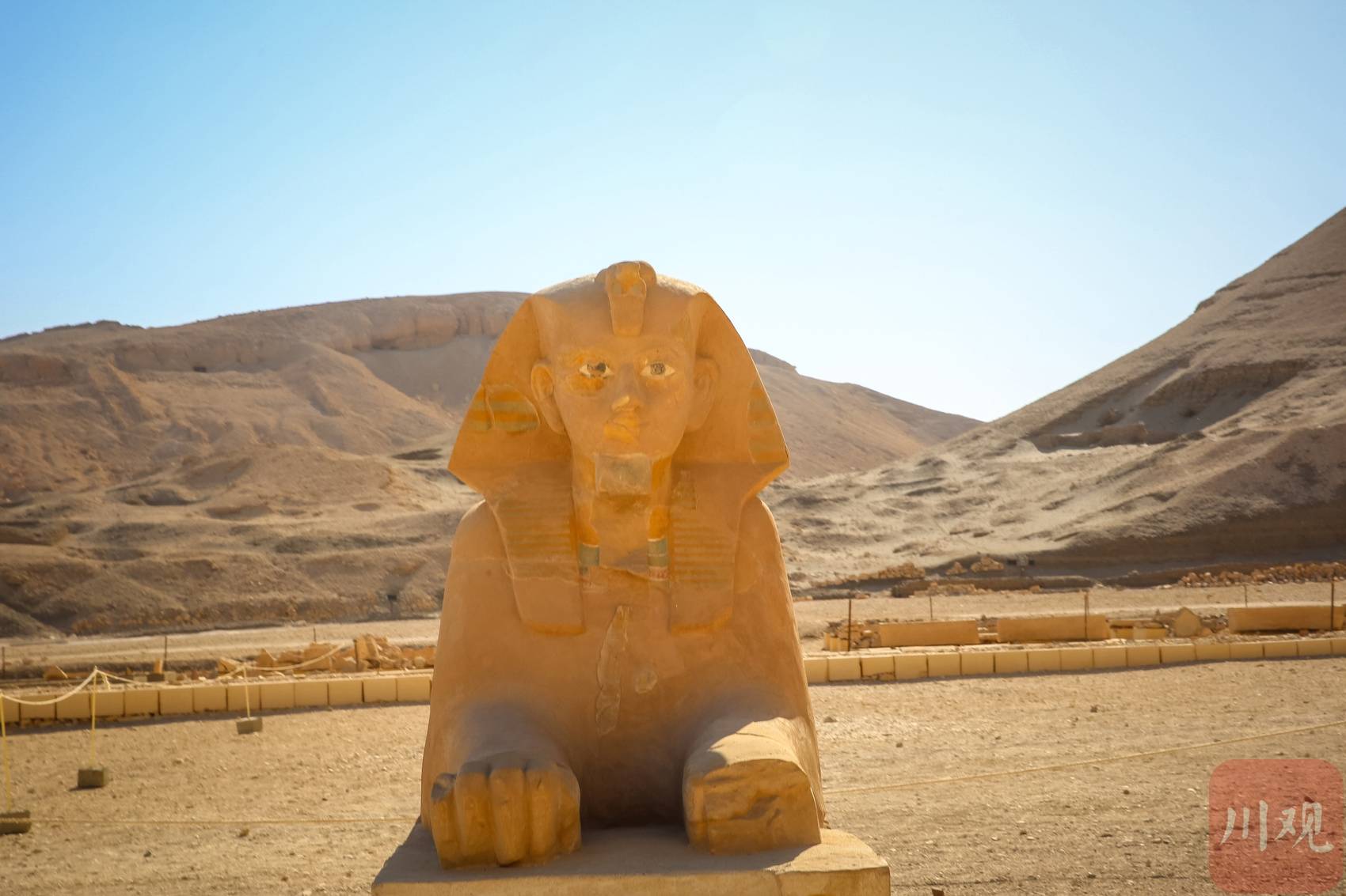 帝王谷旁,狮身人面像背靠黄褐色山峦静卧沙漠中。