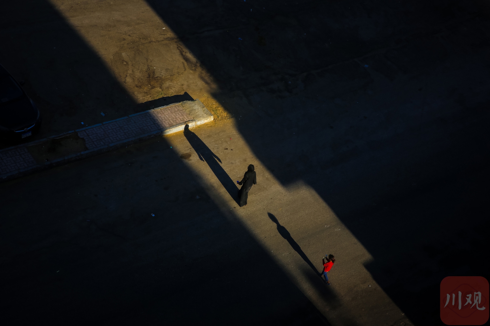 光影勾勒的路面上,行人与影子相伴。