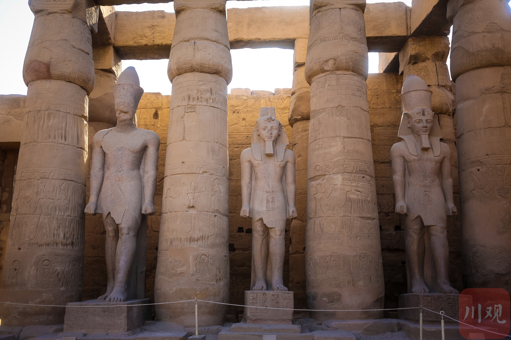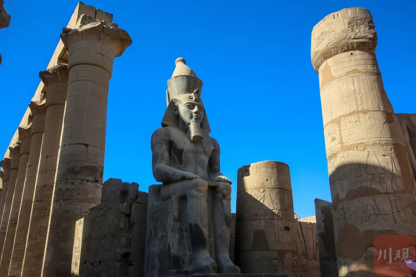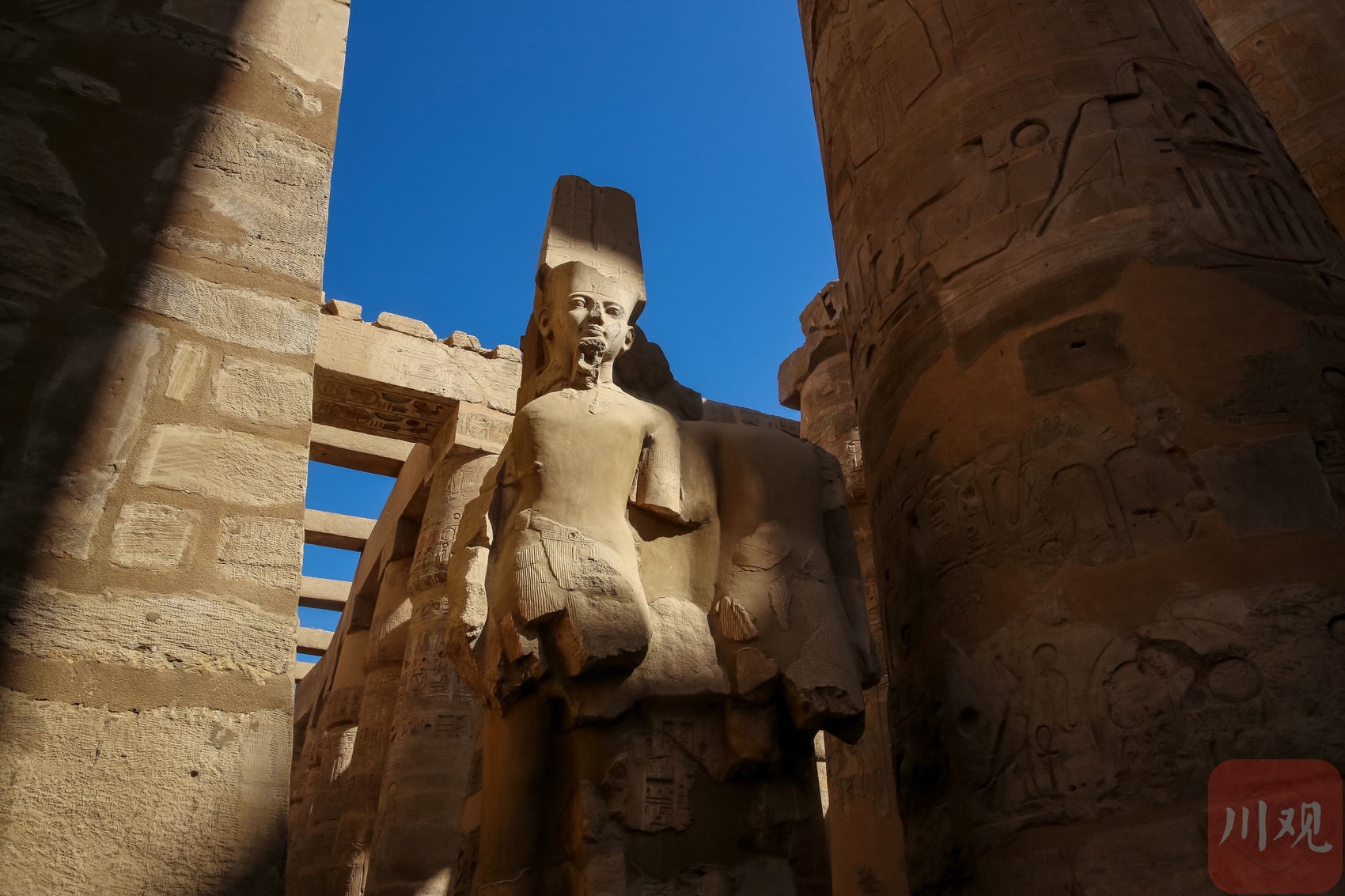 卡纳克神庙内,古埃及法老石像与巨型石柱并肩而立。