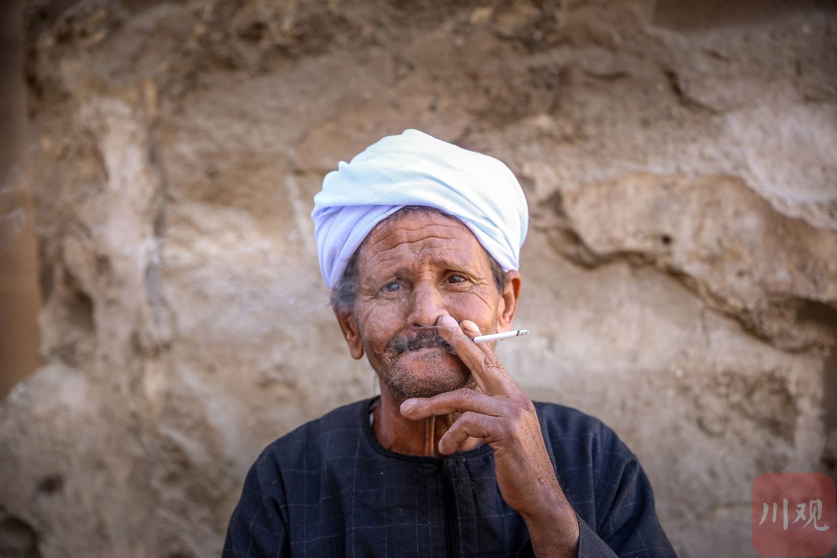 埃及古建筑遗址旁,头戴传统白头巾的老者。