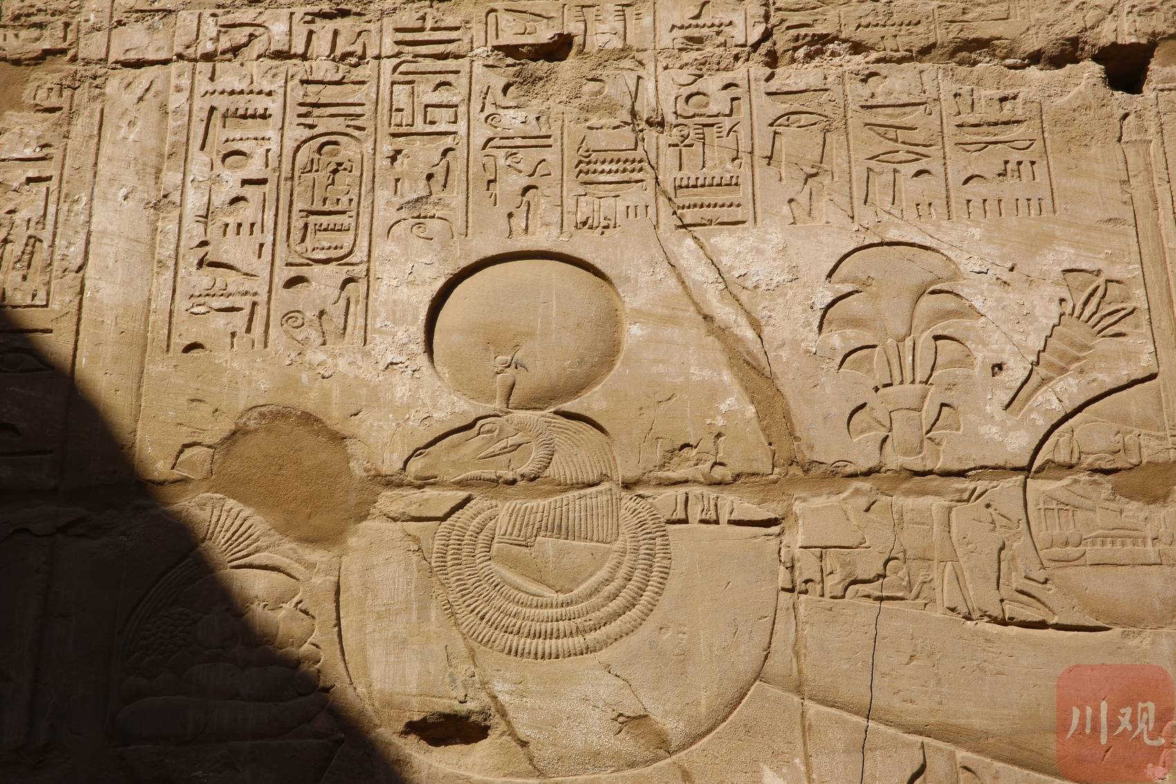 古埃及神庙石壁,象形文字与神兽浮雕共存。