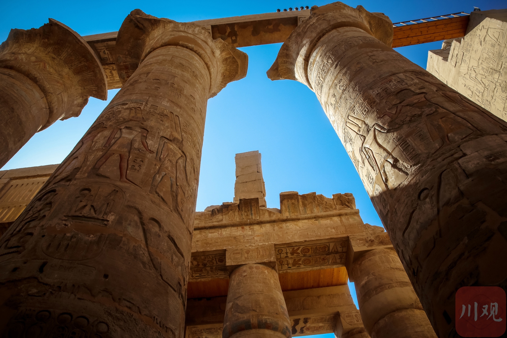 卡纳克神庙巨型石柱擎天而立,柱身象形文字斑驳。