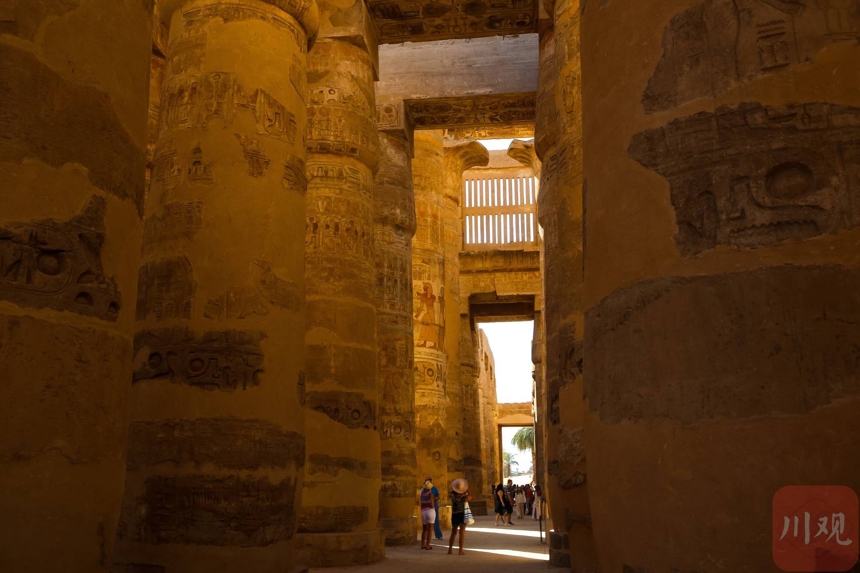卡纳克神庙多柱厅,巨型石柱刻满象形文字,游客穿梭其间。