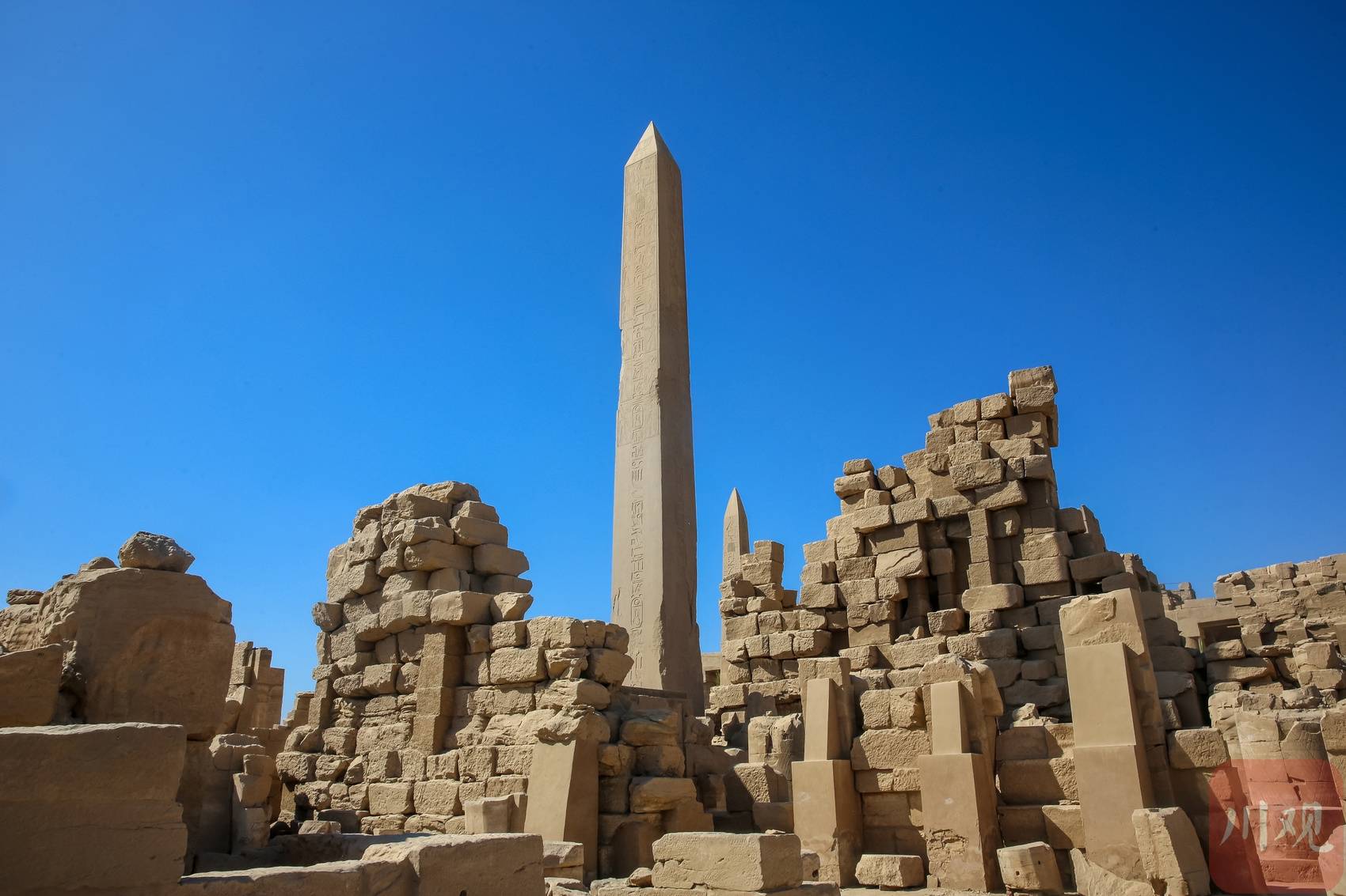 埃及卢克索神庙遗址,方尖碑矗立在断壁残垣间。
