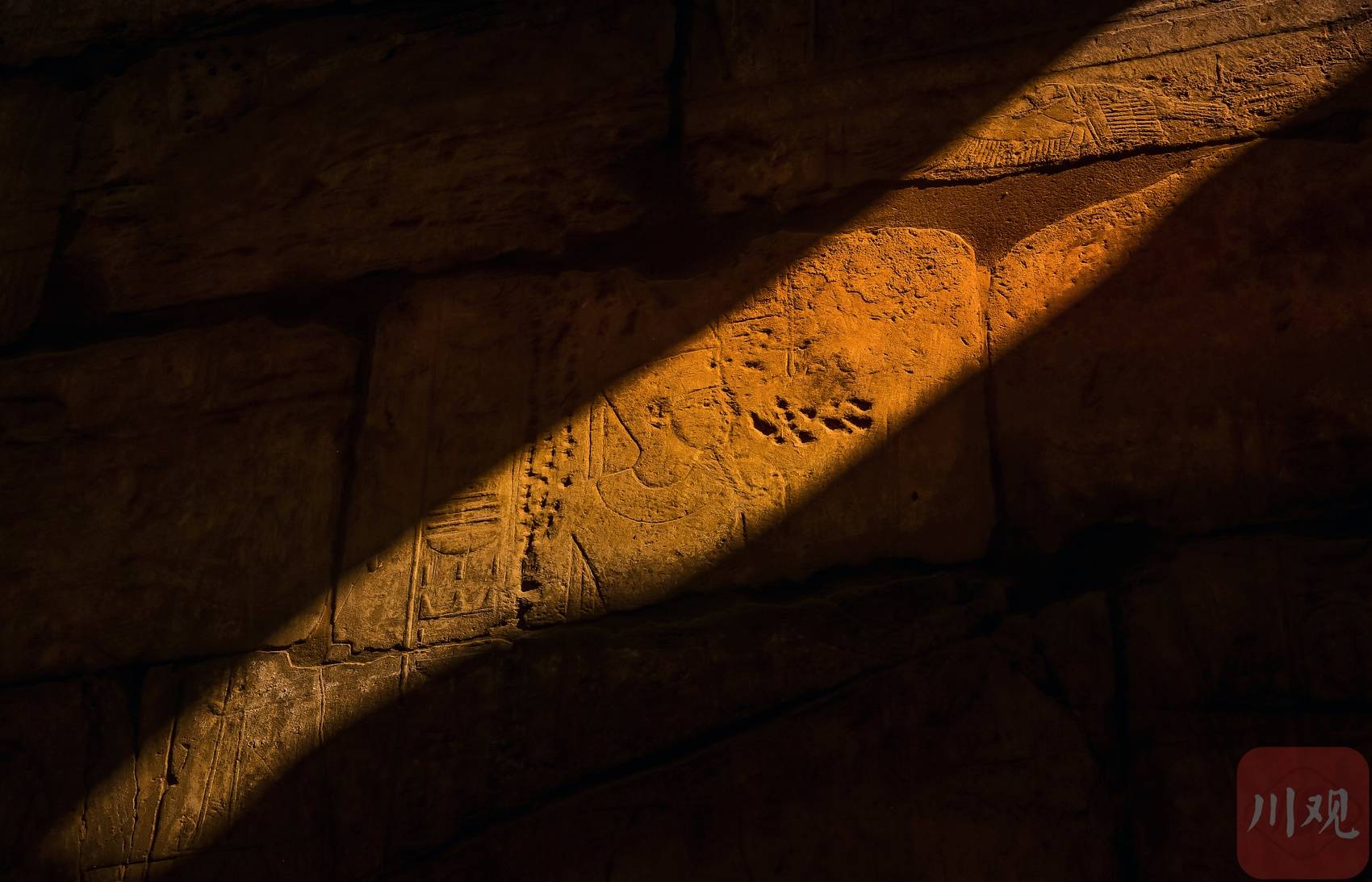 埃及古神庙石壁,阳光斜照,照亮神秘象形文字浮雕。