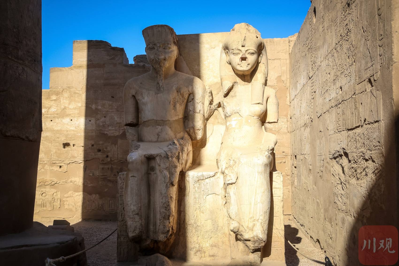 埃及卢克索神庙遗址内,两座残缺的古埃及人物石像,在光影与斑驳石壁间,诉说着千年历史沧桑 。